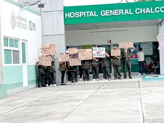 Trabajadores del área de limpieza del Hospital General de Chalco, integrado al esquema IMSS-Bienestar, llevaron a cabo una protesta pacífica ayer viernes, para exigir el pago inmediato de sus salarios, así como certeza laboral ante lo que consideran un acto de abandono patronal por parte de la empresa subcontratada denominada Fortaleza.