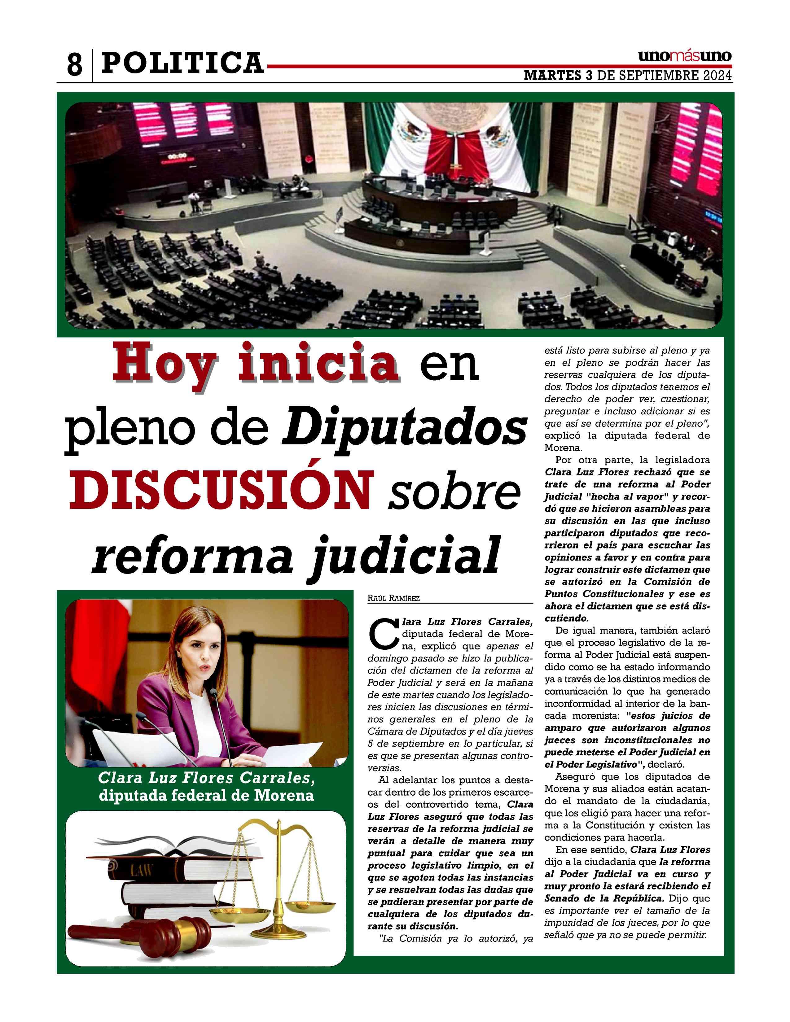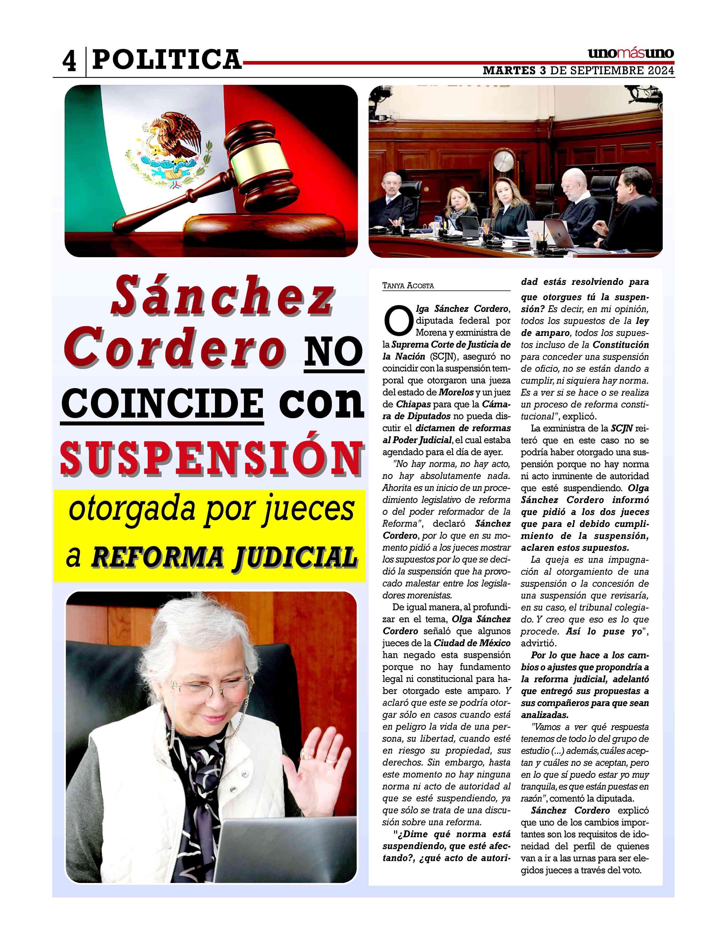 "Como se trata de una reforma constitucional,no sólo se necesita la aprobación de una mayoría calificada en las dos cámaras (de Diputados y Senadores),sino también se requiere que la mitad más uno de los congresos locales aprueben,pero esta juez dice:'no se envíe a los estados',o sea,pretenden detener el proceso legislativo y para los que son respetuosos de la Constitución, de las leyes,es conveniente que sepan que en la Constitución está establecido que es facultad del Poder Legislativo discutir, aprobar las leyes; de ningún otro poder", abundó.