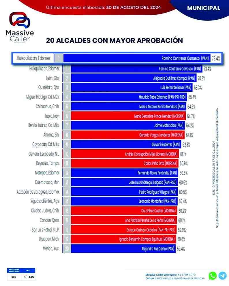 La más reciente medición de la casa encuestadora,dadaaconocer este 30 deagosto, Romina Contreras secolocaenelprimerlugarentrelos 125 alcaldes de todo el país incluidos en este ranking nacional, con lo que son 16 ocasiones en primer lugar a nivel nacional y 32 ocasiones consecutivas entre sus homólogos de la entidad. Massive Caller llevó a cabo esta encuesta mediante la técnica de "robot", con 600 llamadas en forma aleatoria a los hogares, con un margen de error de +/-4.3 por ciento.