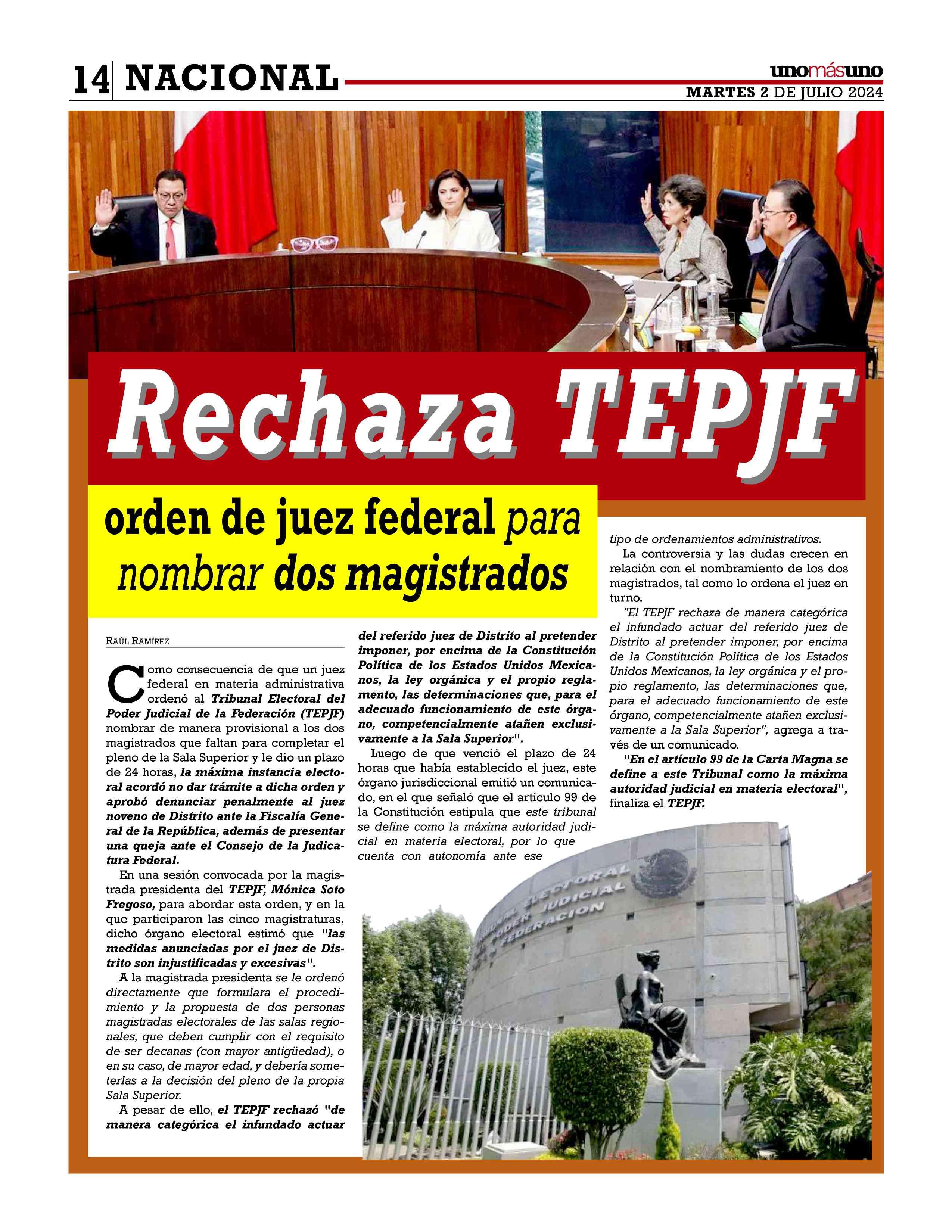 AñoXLV-Número16214Martes2dejulio2024 UNOMÁSUNONACIONAL.EditorResponsable:NAIM LIBIENKAUI.Publicacióndiaria,editadaydistribuidaporLIBIEN &SON’SSAdeCVentalleresdeGabinoBarreda86bis.Col.San Rafael,CiudaddeMéxico,C.P.06470,DelegaciónCuauhtémoc TeléfonoCDMX:55/10555500.Ext.Redacción102-103y105, PlantaToluca017221340000Ext.116. Losartículosynotaspublicadosenesta edición,sonresponsabilidaddequienlosfirma.