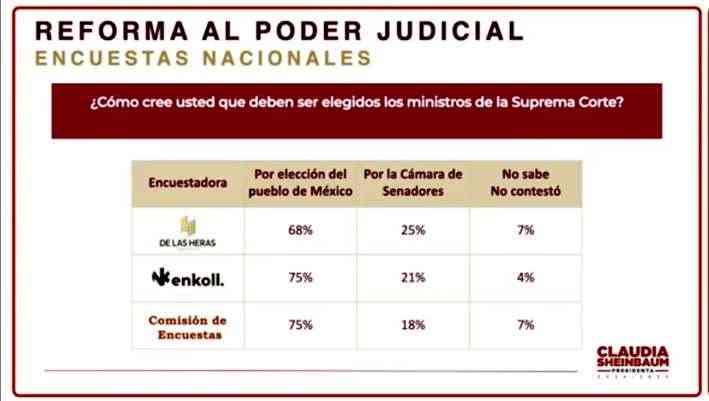 Sheinbaum Pardo informó que, de acuerdo con los resultados, 77 % de los encuestados por De las Heras Demotecnia considera que es necesario una reforma al Poder Judicial; en Enkoll, 83 %,y en el ejercicio realizado por la