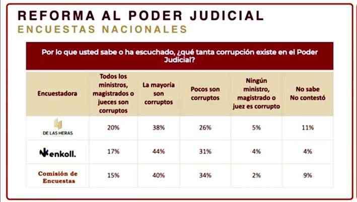 A la pregunta, ''¿qué tanta corrupción existe en el Poder Judicial?'', los encuestadosrespondieron quelamayoría de los magistrados, jueces y ministros son corruptos: 38 % en De las Heras Demotecnia; 44 % en Enkoll, y 40 % en los resultados de la Comisión de Encuestas de Morena