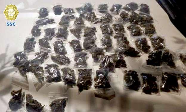 Alasdospersonasselesindicóquedescendierandelaunidadyalrealizarlesuna revisióndeseguridad,leshallaronunabolsa deplásticonegroqueconteníaensuinterior60bolsaspequeñasconunvegetal verdeysecoconlascaracterísticasdela marihuana,ademásdeseisteléfonoscelulares,doscarterasydineroenefectivo"