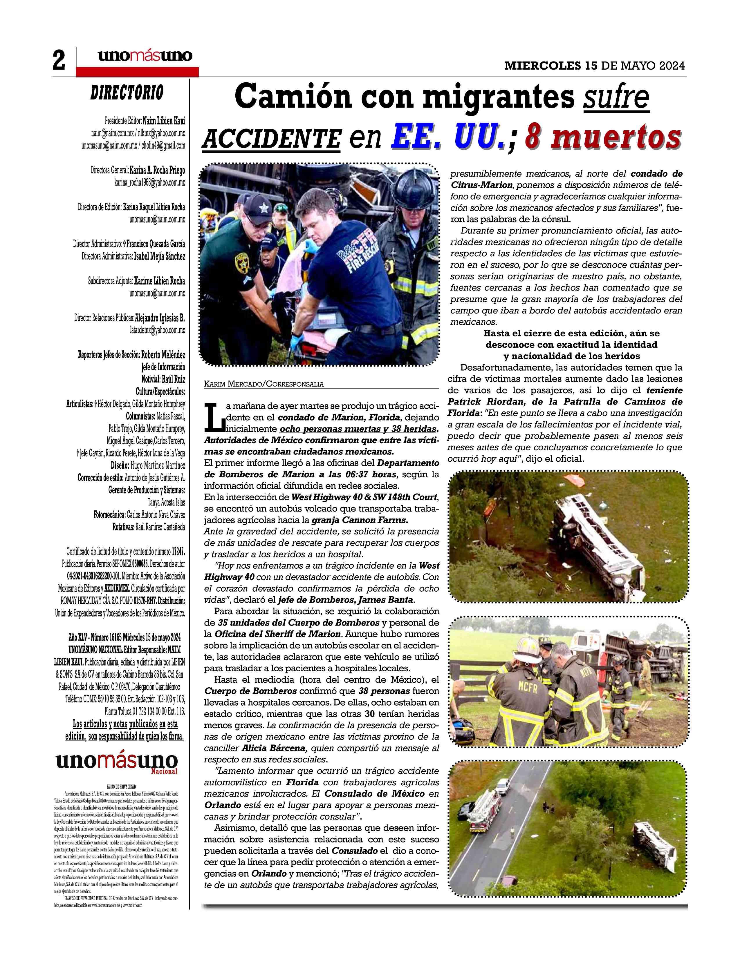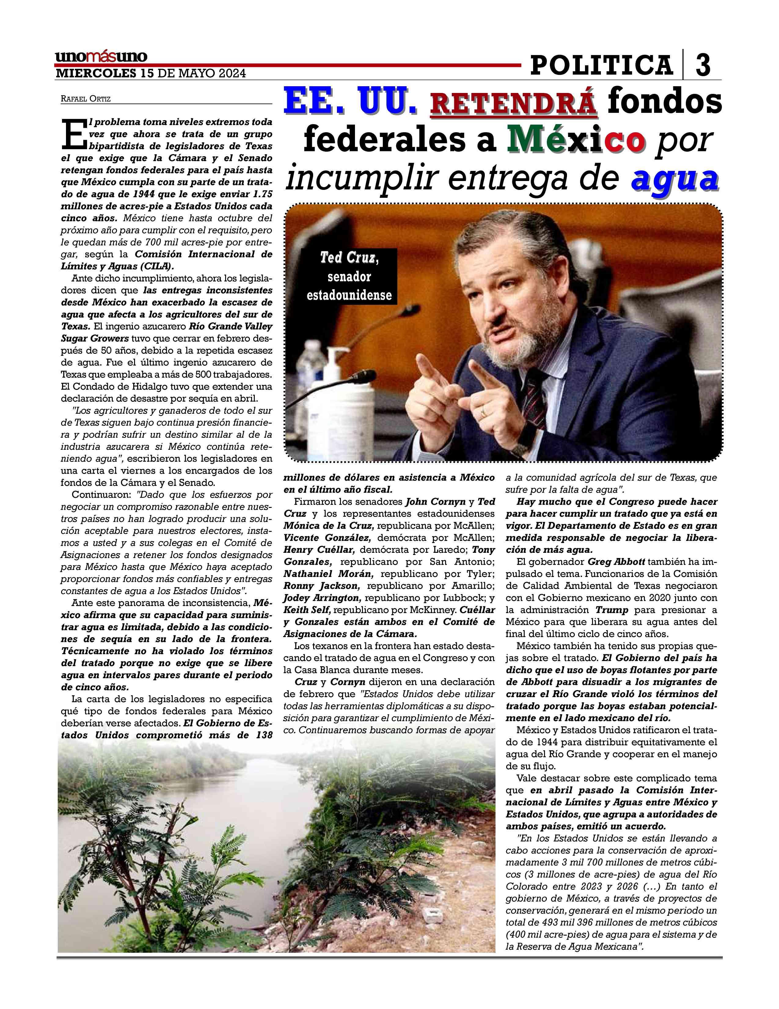 Pesos PresidenteEditor:Dr.NaimLibienKauiDirectoraGeneral:Dra.KarinaA.Rocha AñoXLIVNÚMERO16165 P.6 P.4 P.5 P.15 EE.UU. EE.UU.RETENDRÁRETENDRÁfondosfederalesa Mé Méxixico coporincumplirentregadeagua agua TedCruz, TedCruz,senador estadounidense 10 P.3 MIÉRCOLES15DEMAYO2024