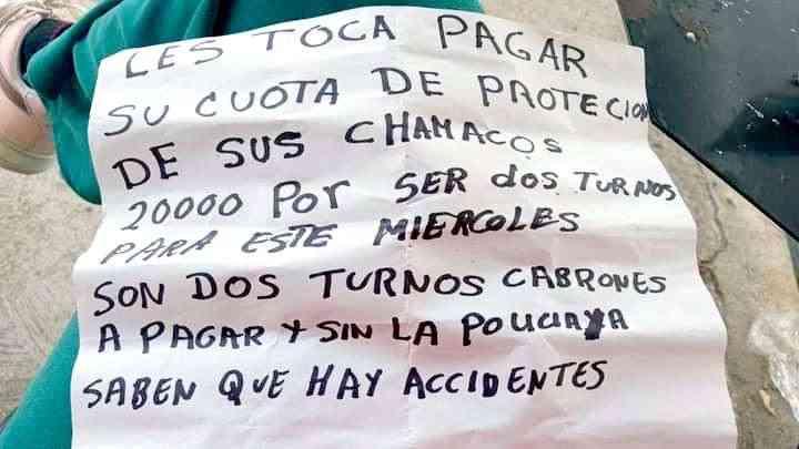 "Les toca pagar su cuota de protección de sus chamacos, 20 mil por ser dos turnos para este miércoles,son dos turnos cabrones a pagar ysin la policía, ya saben que hay accidentes", exponen en su mensaje los responsables, quienes no revelaron el grupo delictivo al que pertenecen.