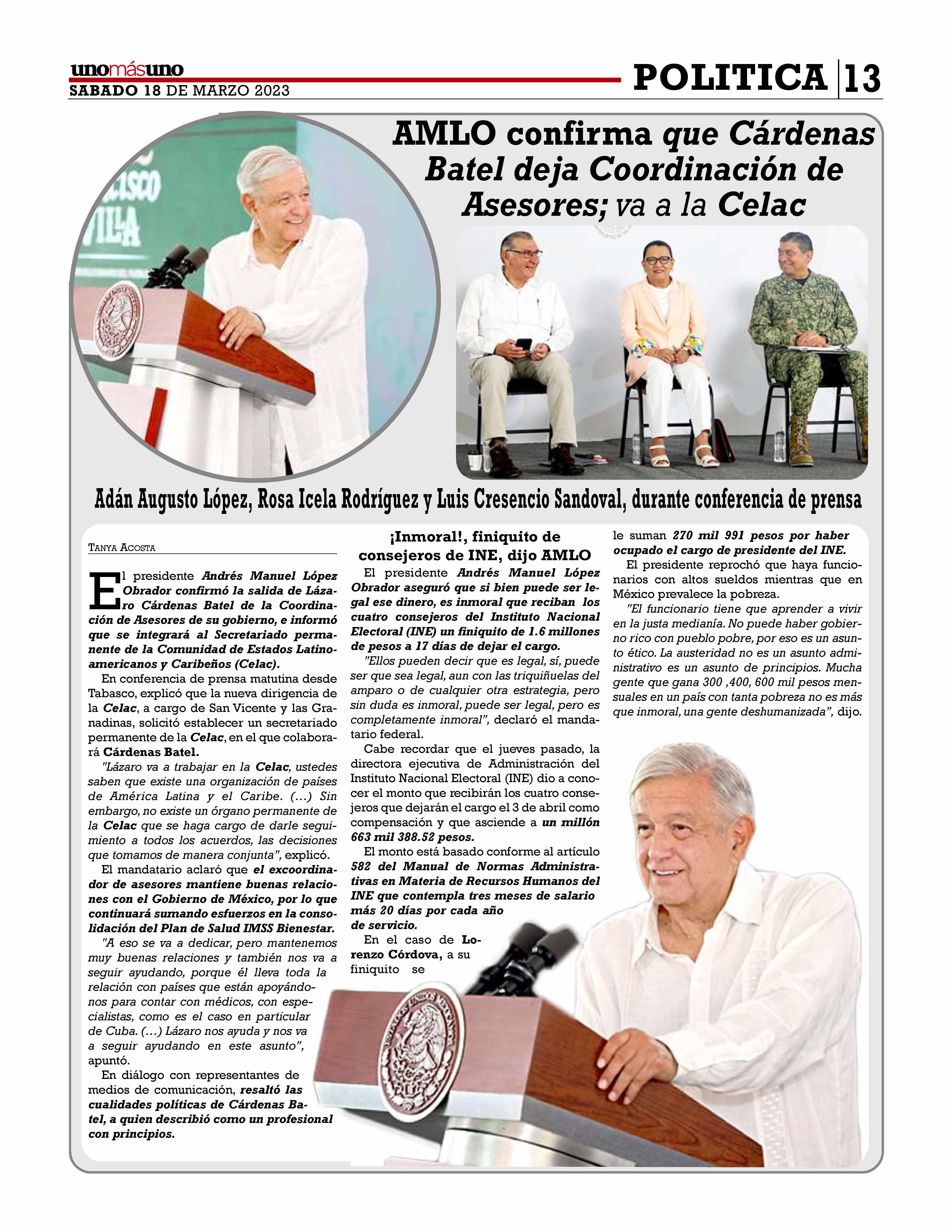 "Los mexicanos tiene derecho a saber el monto de la liquidación de Lorenzo Córdova y de los otros tres consejeros que ya se van el 3 de abril próximo,en menos de un mes.Han ganado muy bien estos nueve años,así que no deberían ocultar el tema de su finiquito y llevarse uno que resulte ofensiva para los mexicanos, sostuvo en un comunicado".