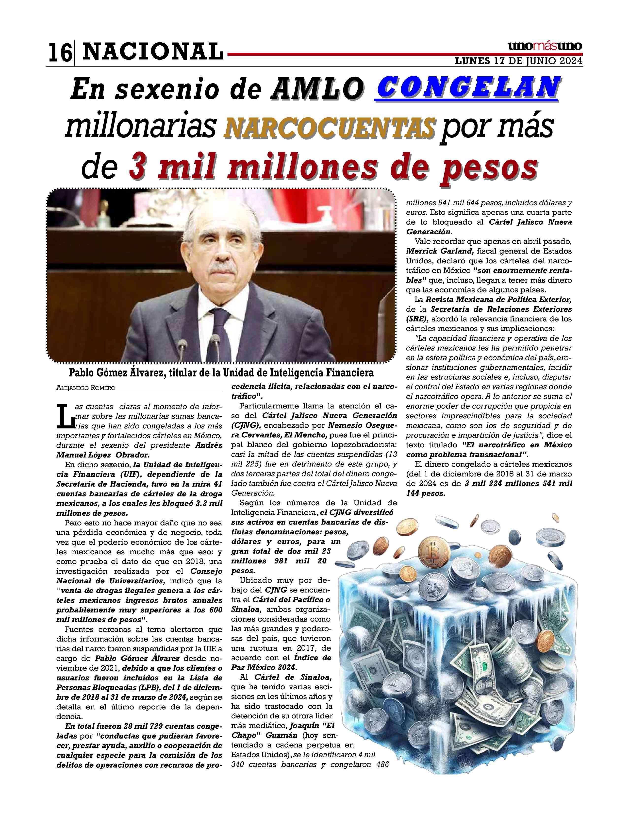 AñoXLV-Número16198Lunes17dejunio2024 UNOMÁSUNONACIONAL.EditorResponsable:NAIM LIBIENKAUI.Publicacióndiaria,editadaydistribuidaporLIBIEN &SON’SSAdeCVentalleresdeGabinoBarreda86bis.Col.San Rafael,CiudaddeMéxico,C.P.06470,DelegaciónCuauhtémoc TeléfonoCDMX:55/10555500.Ext.Redacción102-103y105, PlantaToluca017221340000Ext.116. Losartículosynotaspublicadosenesta edición,sonresponsabilidaddequienlosfirma.