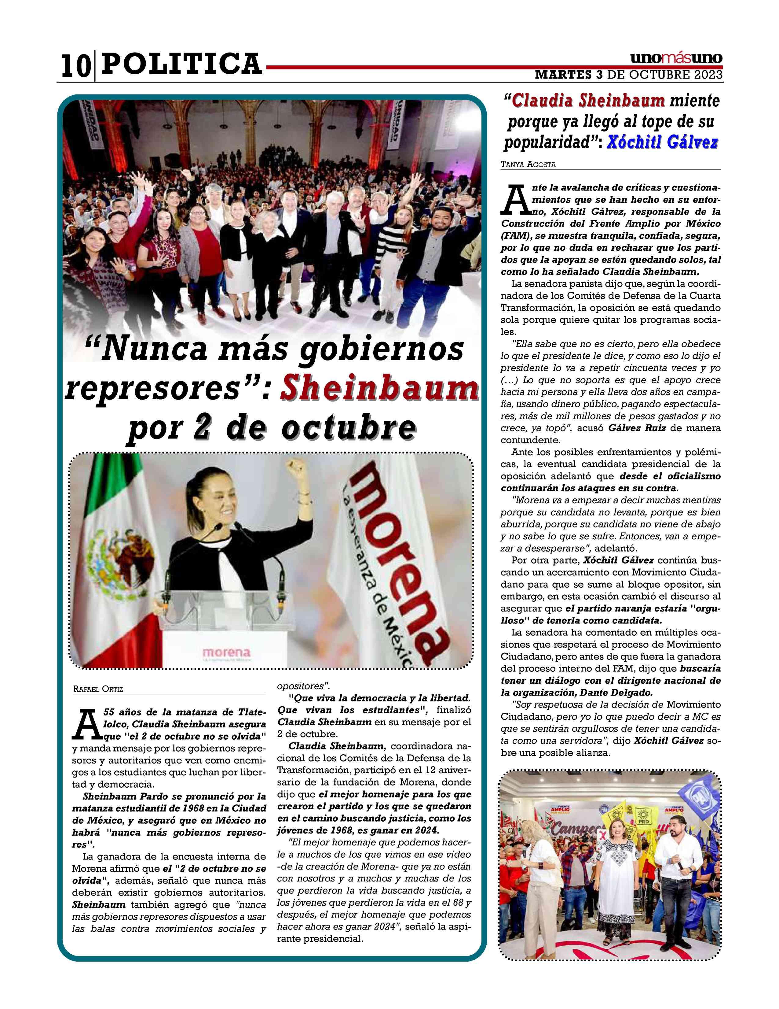 La alcaldesa de Cuauhtémoc, Sandra Cuevas, en el marco del 55 aniversario de los hechos ocurridos el 2 de octubre de 1968enTlatelolco,hizo unllamadoalaciudadanía a levantar la voz,ya que tenemos un México "cansado" y en donde hace falta exponerapolíticosquesólobuscanel poder. Luego de izar la bandera nacional a media asta en la explanada de la Plaza de las Tres Culturas y depositar una ofrenda floral en memoria de los caídos, resaltó el espíritu de aquellos jóvenes cuyas voces retumbaron en esta plaza por su sueño de ver un país mejor.