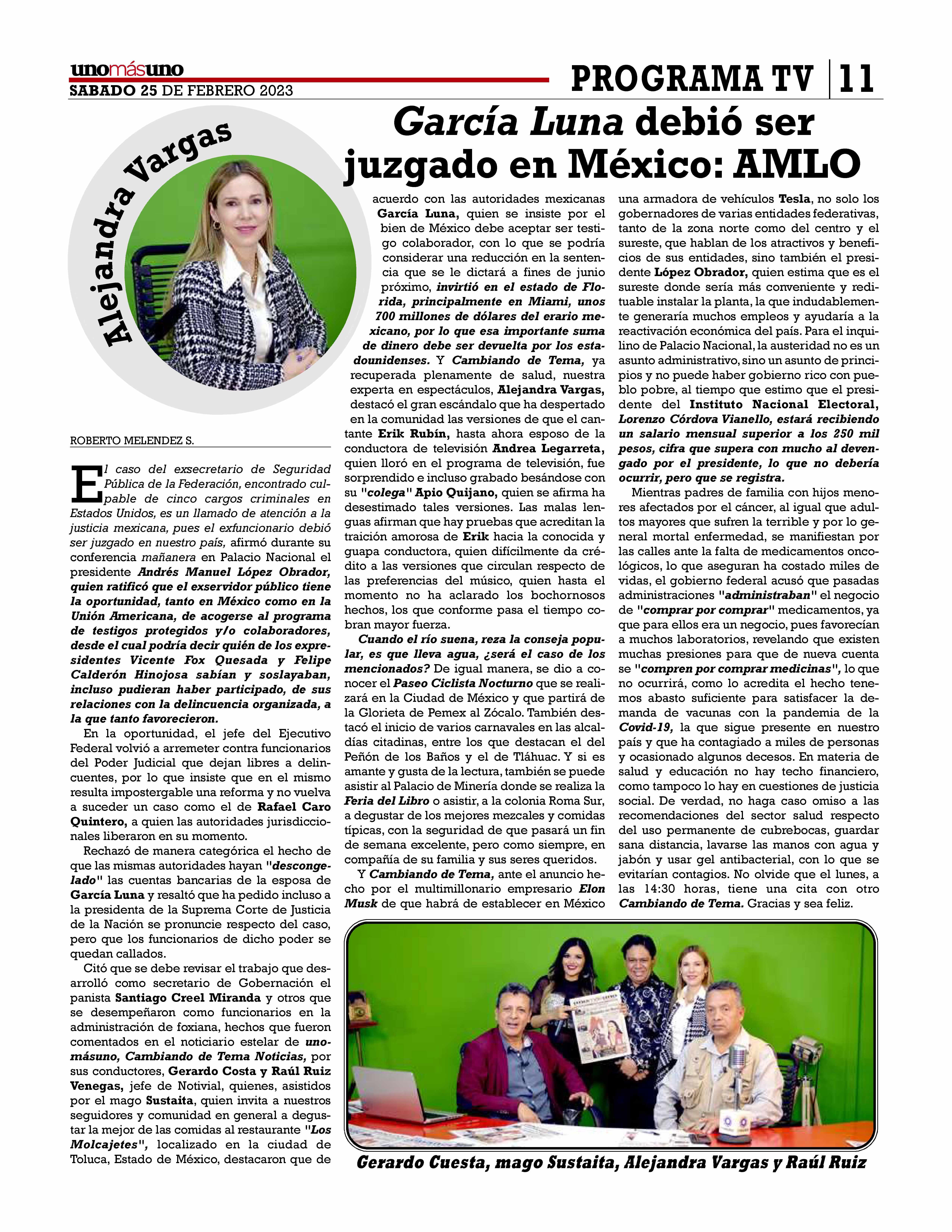 "Genaro García Luna se está tardando en haber llegado a un trato con la Fiscalía de los Estados Unidos, es una persona muy inteligente,realmente él estuvo midiendo a los fiscales qué tanto tenían en su contra, hasta dónde iban a llegar y él conoce las leyes de Estados Unidos, sabe que en cualquier momento él puede negociar delatando a sus superiores jerárquicos,y sus superioresjerárquicos sonFelipeCalderón HinojosayVicente Fox Quesada".