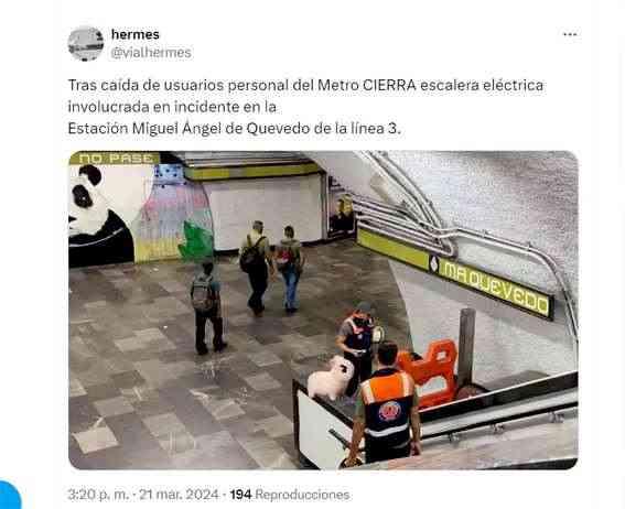 Latardedeayerjueves,enlaestación MiguelÁngeldeQuevedoLínea3,se registróunaccidenteenlasescaleras eléctricasdelcualresultaronlesionados3masculinosy2féminas:DanielaNicoleVieyra Ochoa,de24años,policontundidaylaceracionesenpiernaderecha,pantorrilladerecha, quienfuetrasladadaalhospitalSanAngelín. PedroGuareñaGándara,62años,conheridaabrasivaenrótulaizquierdaycontusión enregiónfrontalyunaheridaabrasiva decúbitoradializquierdoenextremidad superiorizquierdayheridaabrasivaen escápulaizquierda;noameritótraslado.