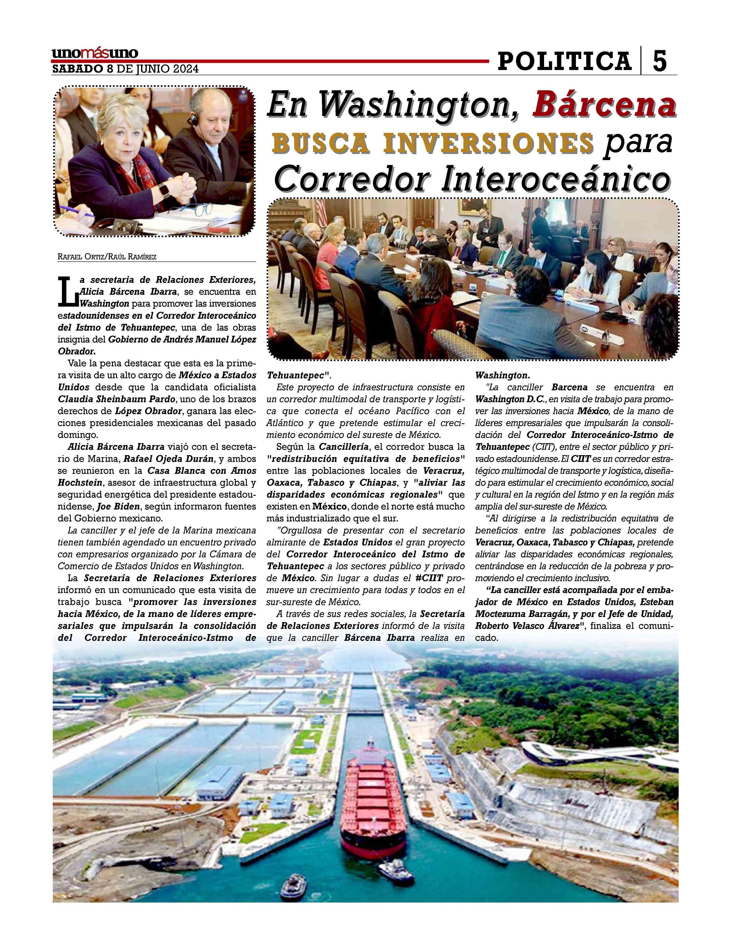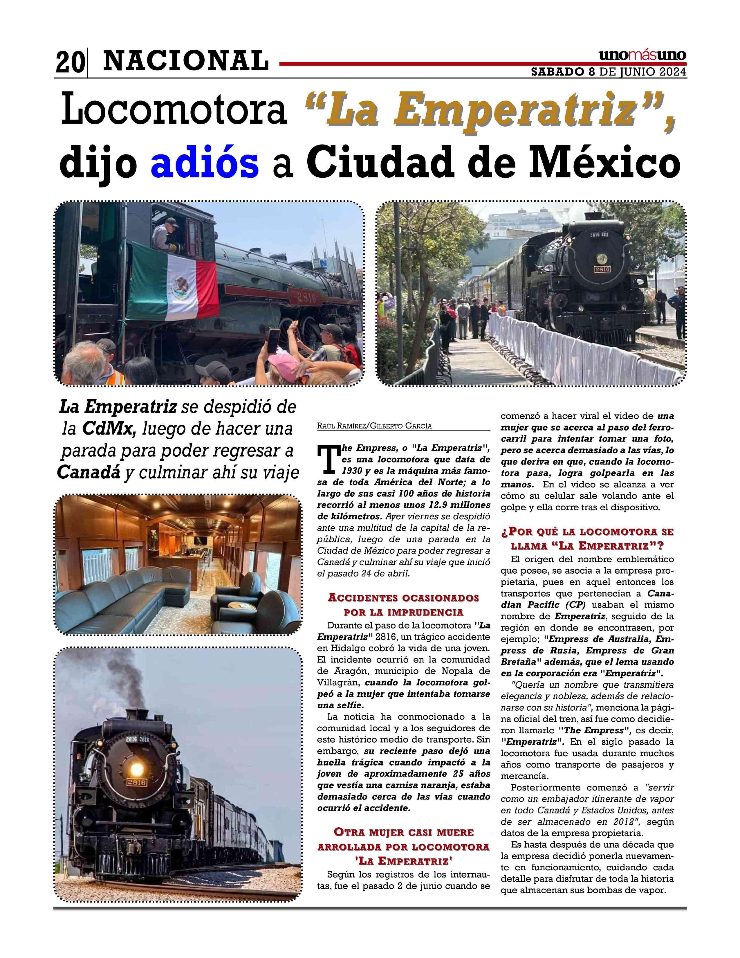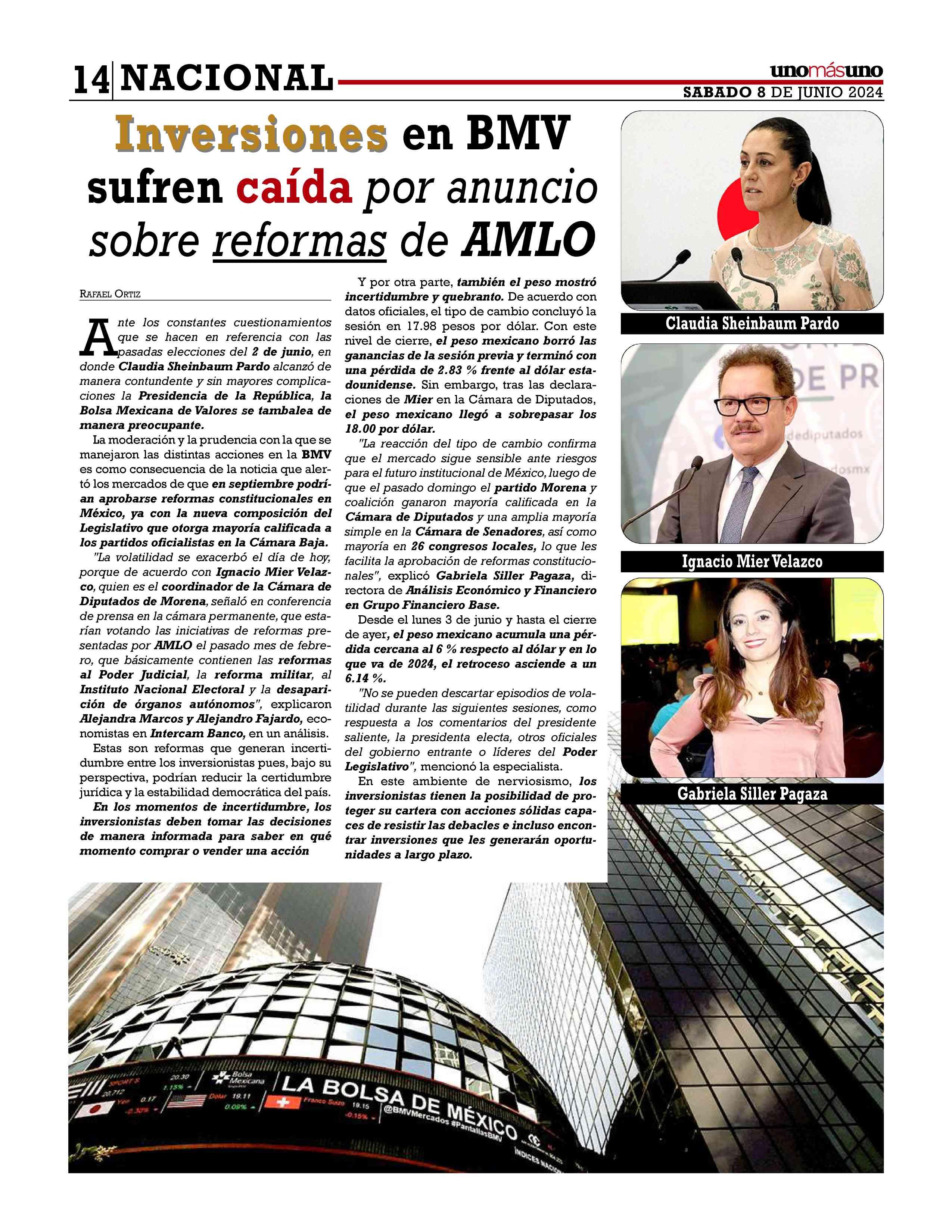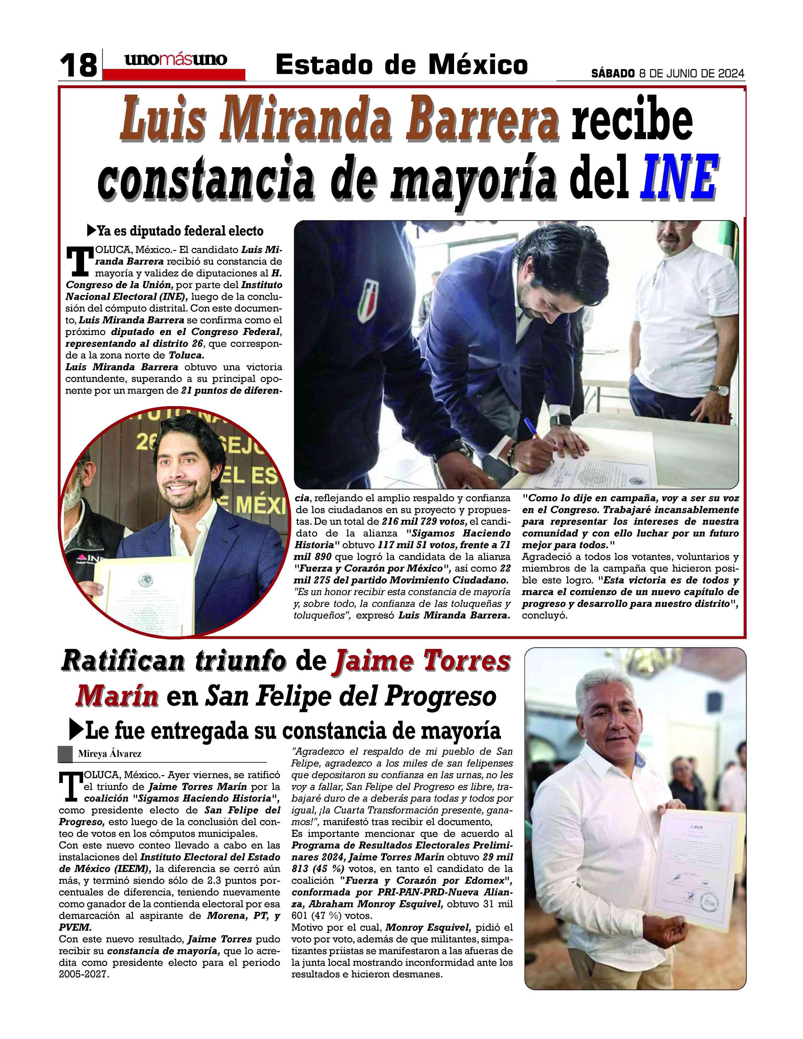 AuténticodelaRevoluciónMexicana, PopularSocialista,CardenistayMéxico, posible,entreotros,formanpartedelos"desaparecidos"yconelloladesgraciaeconómica ypolíticadenopocosdesusagremiados,lo quefuedestacadoenelnoticiarioestelarde unomásuno,CambiandodeTemaNoticias, porSusiBazán,RaúlRuizVenegasyJoséLuis Sustaita,quienesbajoladireccióndenuestro presidenteeditor,NaimLibienKaui,ratificaronqueseráelpróximodomingocuando SheinbaumPardo,quienllamaalaunidada todoslosciudadanos,recibalaconstanciade mayoríaquelaacreditacomopresidentaelectadelpaís,cargoquedeberáasumirel1de octubre,díaenqueseestimaAndrésManuel LópezObradorabandonaráPalacioNacional para,seguramenteviajarasurancho,ubicado enChiapas,acontemplar,comoélseñala,el vuelodelasguacamayas,eltrinardelospájarosylasbellezasnaturales.