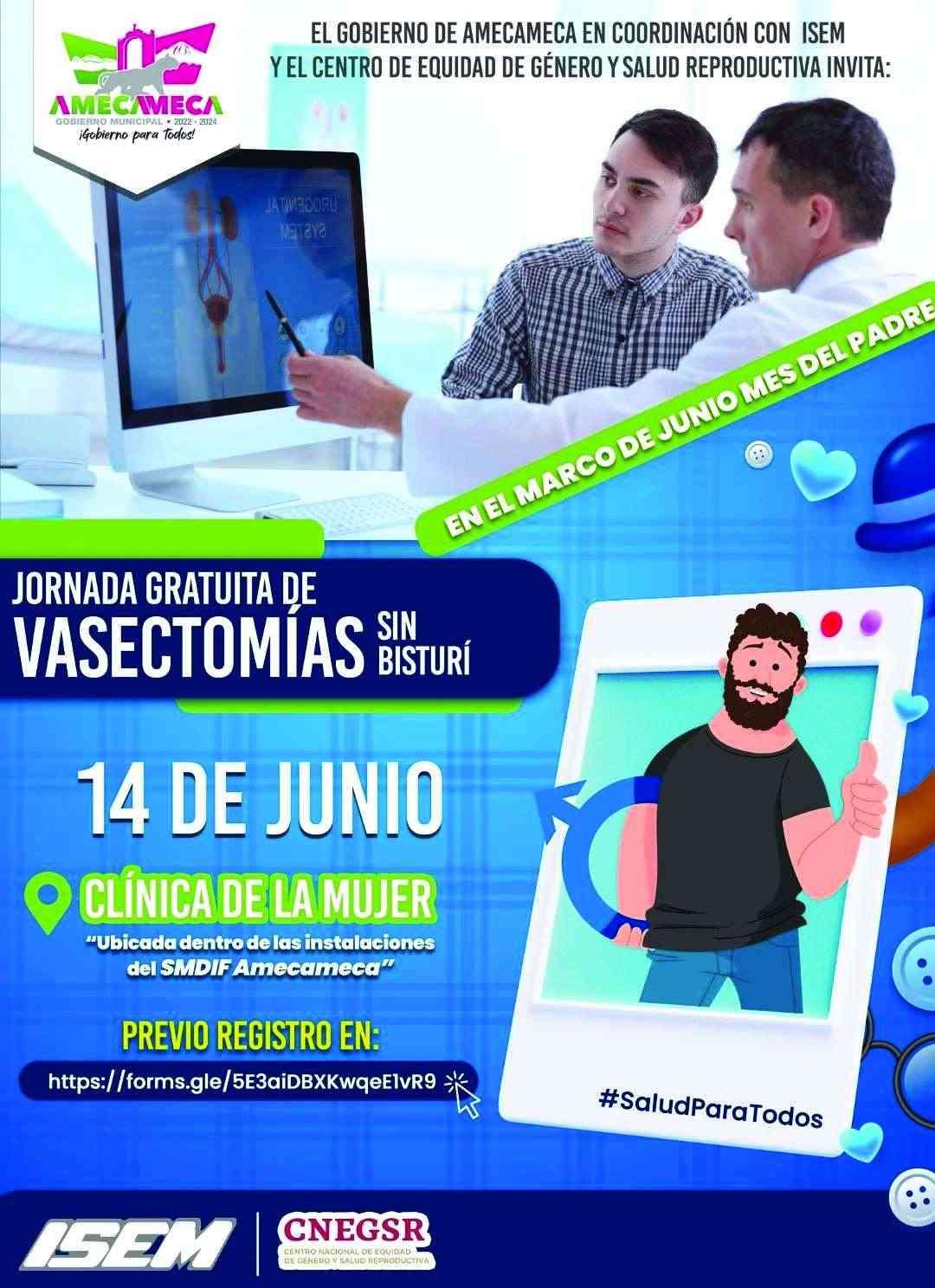 El Ayuntamiento de Amecameca, en colaboración con el InstitutodeSaluddelEstadode México (ISEM), y del Centro Nacional de Equidad de Género, y Salud Reproductiva (CNEGRS), convocaaparticiparenlapróxima "Jornada de Salud Reproductiva", enfocada en la realización de vasectomías sin bisturí, queserealizará parapromoverlasaludreproductiva y proporcionar métodos anticonceptivos seguros y efectivos a la comunidad. Para ello, en el marco del mes de junio, nombrado "Mes del Padre", se realizará la jornadadesaludgratuita,consistenteenvasectomías sin bisturí que se llevará a cabo el 14 de junio 2024, con previa cita, en la dirección https://forms.gle/5E3aiDBXKwqeE1vR9, y una vez realizado el registro, el gobierno municipal contactará a los interesados para asignarleshorariodecitayatenciónpersonal. El gobierno informa que la vasectomía sin bisturí es un procedimiento rápido,seguro y efectivo para la anticoncepción masculina, misma que se realiza sin necesidad de cortes,lo que reduce significativamente el dolor y el tiempo derecuperación;conlacertezaqueestemétodo es ideal para aquellos hombres que han decidido no tener más hijos.