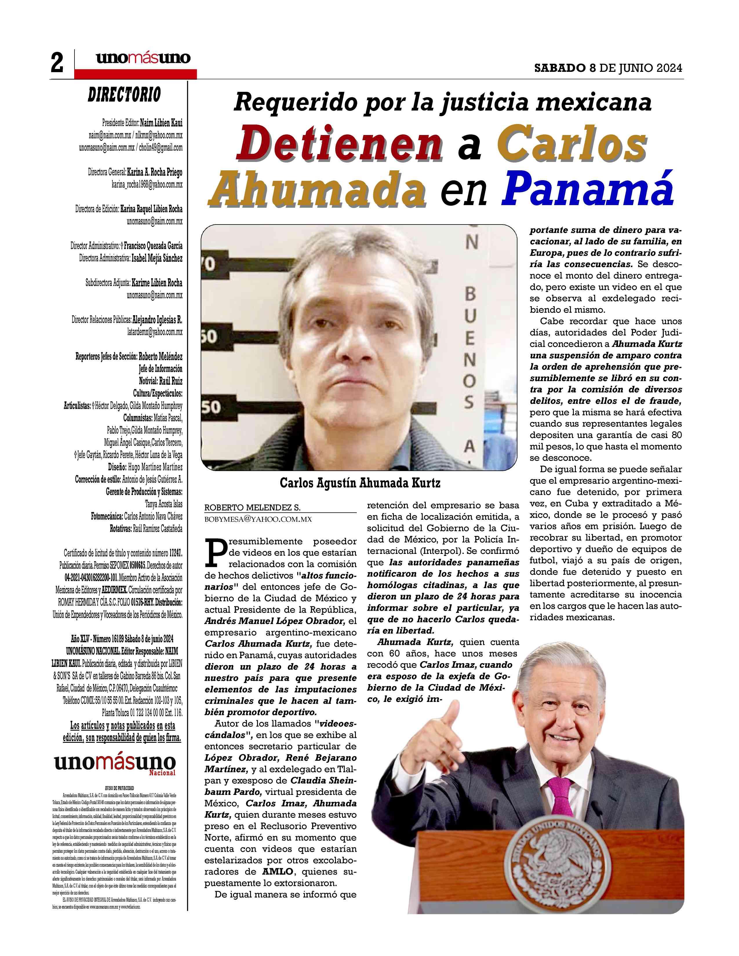 CambiandodeTema,losperiodistas destacaronqueautoridadespanameñas retuvieronalempresariomexicano-argentinoCarlosAhumadaKurtz,autordelos videoescándalos,enlosquefuerongrabadosrecibiendofuertescantidadesdedineroRenéBejaranoMartínez,enépoca secretarioparticulardeLópezObrador, jefedeGobierno,yaldelegadoenTlalpan,CarlosImaz,respectodequienaseguraAhumadaleexigiópagaraelviajevacacionalqueibaarealizarporEuropaacompañadodesushijosyenesosmomentossu esposa,ClaudiaSheinbaumPardo,virtual presidentadeMéxico