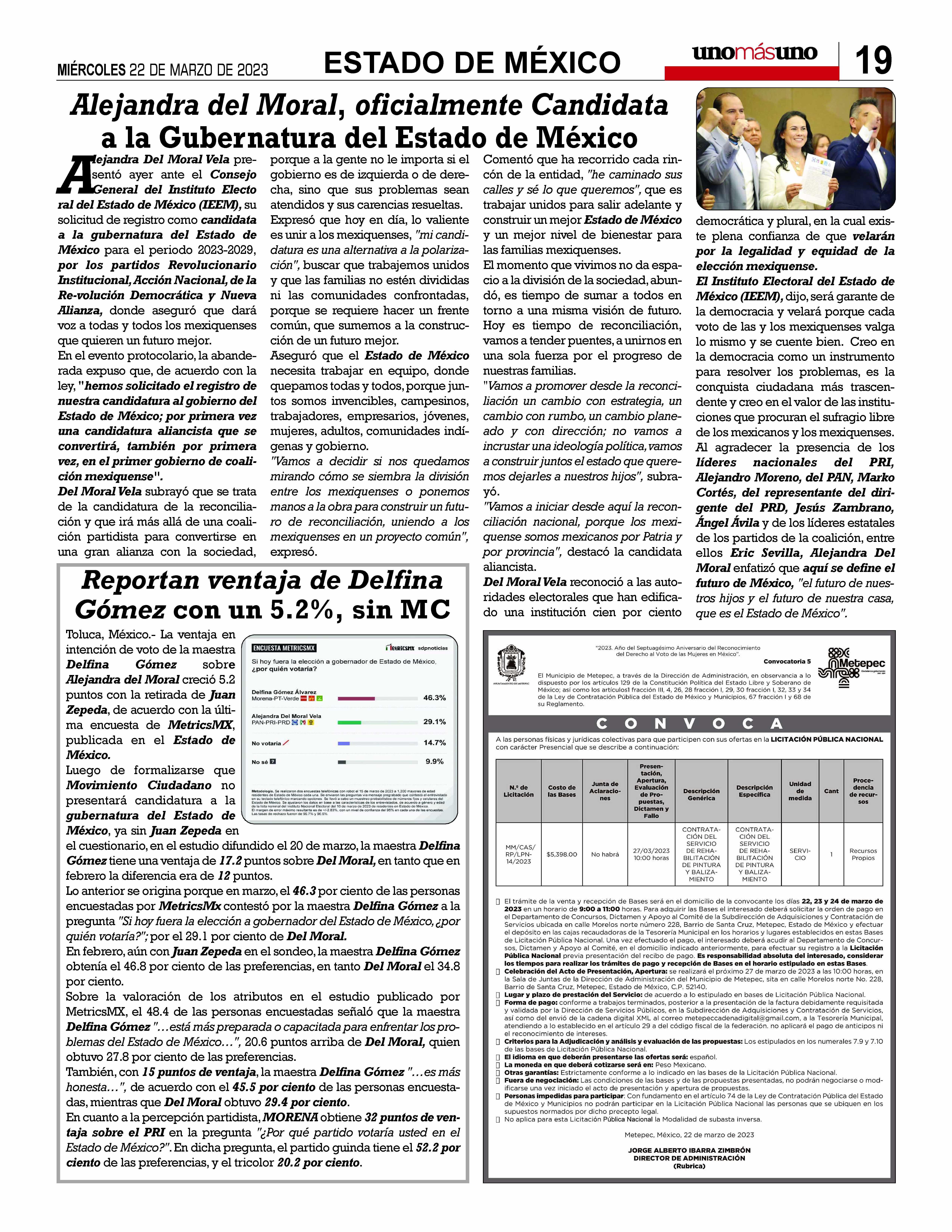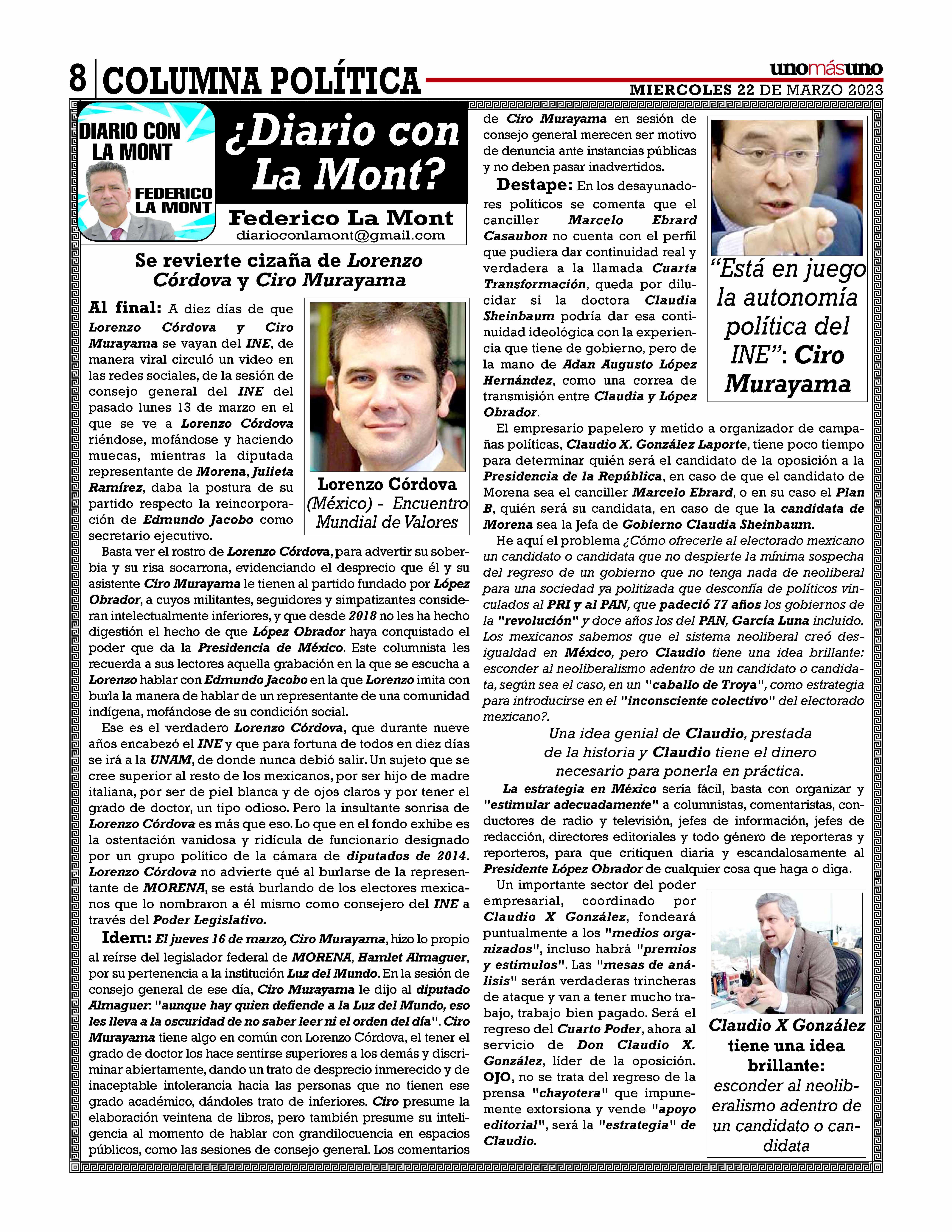 P. 12 5 Pesos PresidenteEditor:Dr.NaimLibienKaui DirectoraGeneral:Dra.KarinaA.Rocha P.5 AñoXLIVNÚMERO15747 MIÉRCOLES22DEMARZO2023 Porenriquecimientoilícito SantiagoTaboada, bajoinvestigación deFGJ-CdMxP.16 AcreedoresdeTV Aztecapideniniciar procesodebancarrota enEE.UU.,informa CorteenNYP.14 Aumentaa61porcientoconfianza ciudadanaenSCJNconNormaPiña TitularesdeSedena yMarinapueden comparecerante PlenodelSenado, adelantaMonrealP.7 Sheinbaum NOesfavoritade AMLO:Ebrard