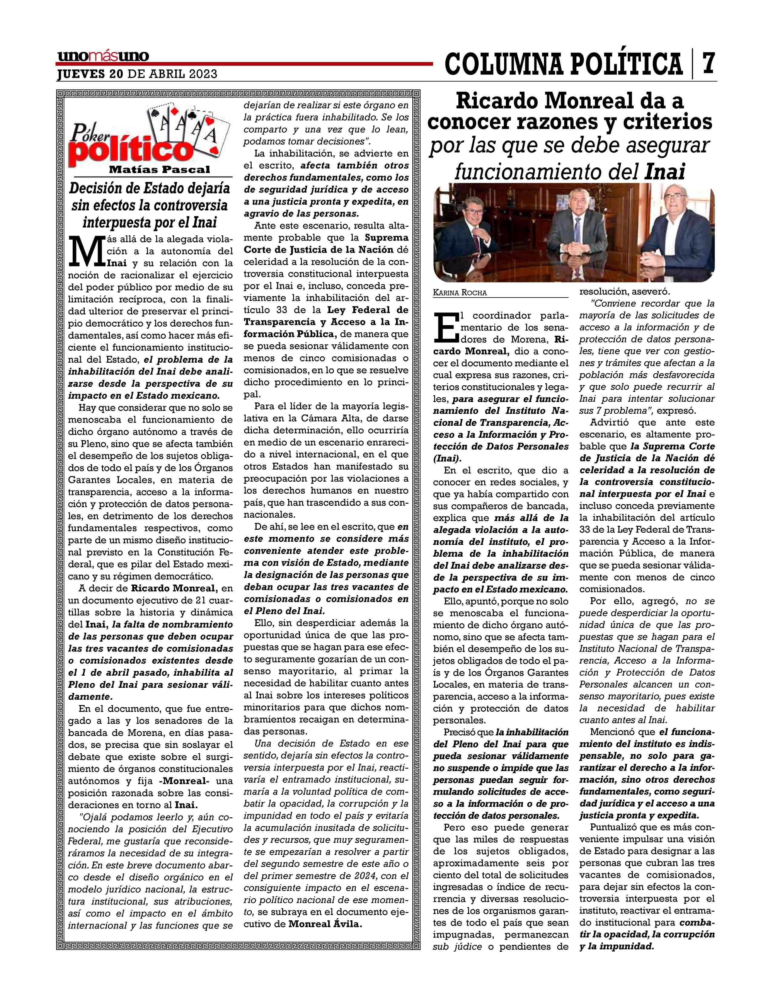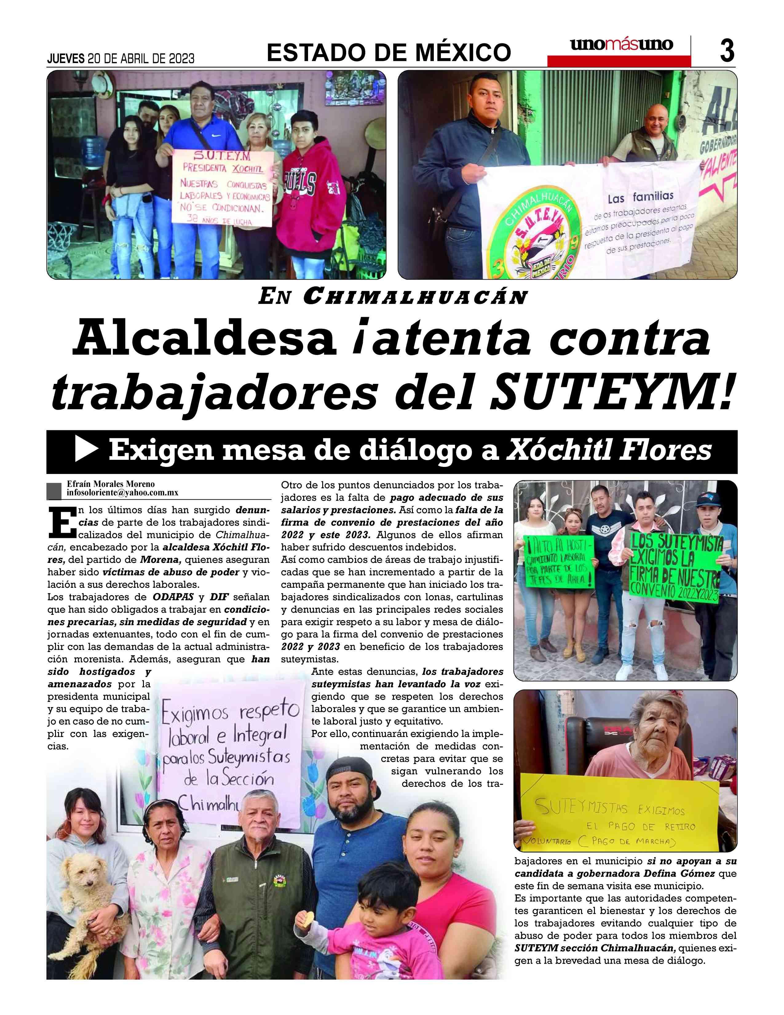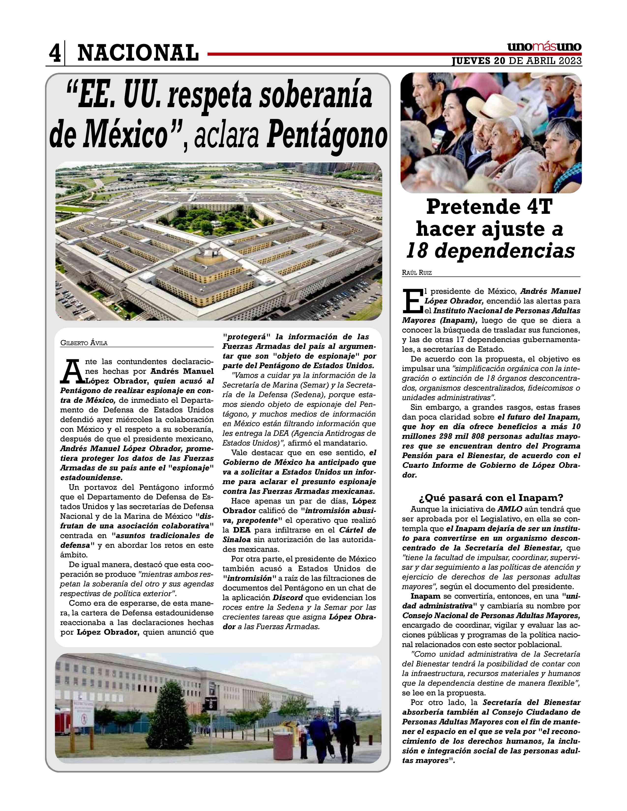 AñoXLV-Número15776Jueves20deabril2023 UNOMÁSUNONACIONALunapublicacióndiaria,editada ydistribuidaporArrendadoraMultiusos,S.A.deC.V. entalleresdeGabinoBarreda86bis.Col.SanRafael,Ciudad deMéxico,C.P.06470,DelegaciónCuauhtémoc TeléfonoCDMX:55/10555500.Ext.Redacción102-103y105, PlantaToluca017221340000Ext.116.
