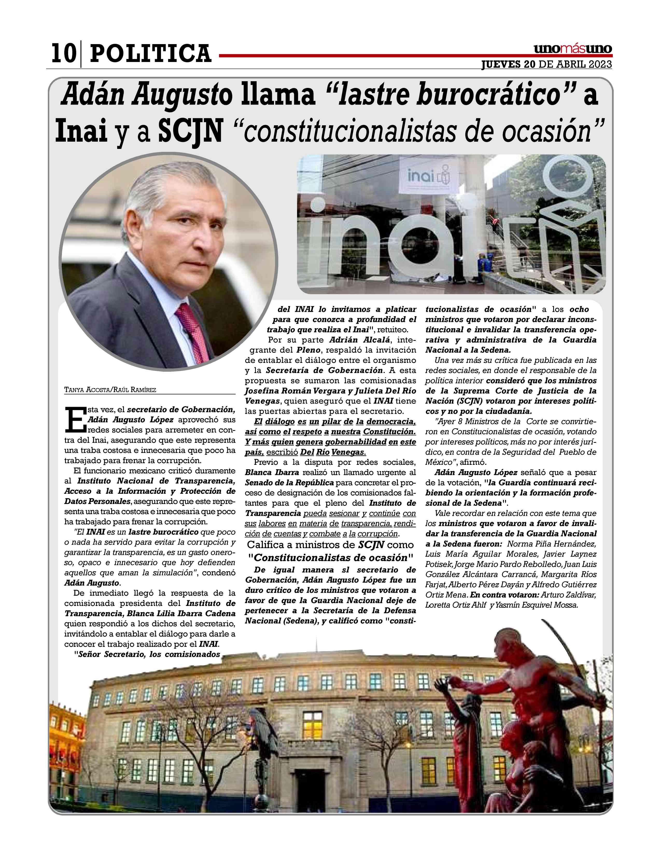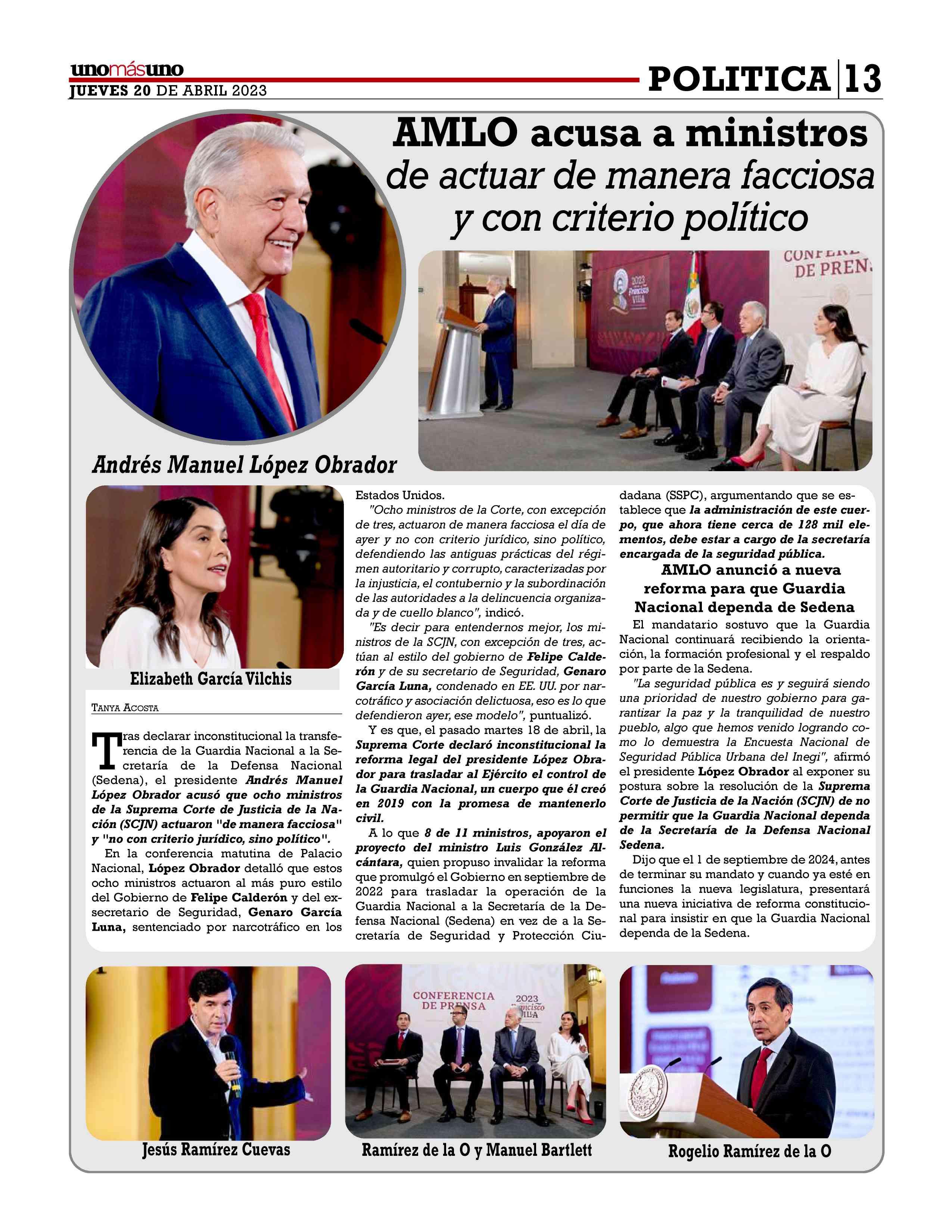 De nueva cuenta y con mayor énfasis, el presidente Andrés Manuel López Obrador arremetió contra los ocho ministros de la Suprema Corte de Justicia que dejaron sin efecto el pase de la Guardia Nacional a la Secretaría de la Defensa Nacional,a quienes acusó de actuar de manera facciosa,con criterios políticos y no jurídicos, estar al servicio de la mafia del poder y defender las antiguas prácticas del régimen corrupto y autoritario, caracterizadas por la injusticia, el contubernio y la subordinación de las autoridades a la delincuencia organizada y de cuello blanco, además de que sentenció que en septiembre del año entrante presentará una nueva iniciativa para que la Guardia Nacional pase de manera definitiva a la Sedena,acciones que fueron comentadas en el noticiario estelar de unomásuno,Cambiando de Tema Noticias,por sus conductores, Gerardo Cuesta y Raúl Ruiz Venegas,quienes bajo la dirección de nuestro presidente editor, NaimLibienKaui, se cuestionaron cuánto en realidad habrá gastado el secretario de la Defensa Nacional, Luis CresencioSandoval, en los viajes que ha realizado, acompañado por sus familiares, amigos y otras personas,al extranjero,en plan de descanso y disfrutando, presuntamente con dinero del pueblo, de los mejores hoteles, restaurantes y centros comerciales. Destacaron, que sobre el particular,el inquilino de PalacioNacional no ha dado una respuesta satisfactoria a los cuestionamientos que todo mundo se hace y todo indica que el asunto, que no es cosa menor en un régimen de austeridad franciscana, queda, como muchos otros, en el comentario para pasar al olvido.Consideraron que lo expuesto por AMLO en su conferenciamañanera,carece de sustento y solo quedan en los dichos del funcionario, quien es un hecho volverá a atacar no solo a los ministros del máximo tribunal de justicia del país, sino a todos aquellos que no estén de acuerdo y compartan sus ideas, así sean equivocadas.