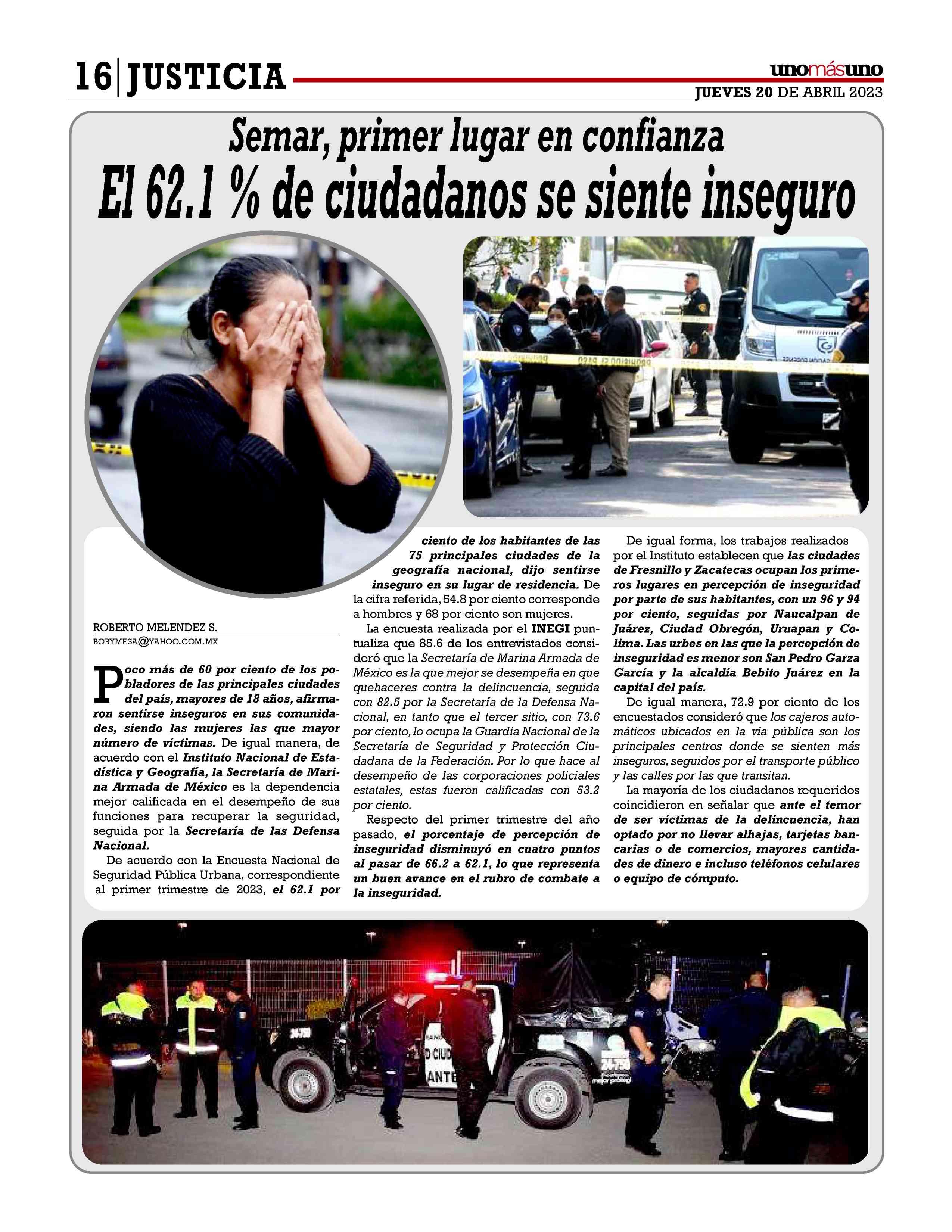 insegurosensuscomunidadesydestacaqueson las Secretarías de Marina Armada de México, Defensa Nacional y Seguridad y Protección CiudadanadelaFederación (Guardia Nacional) en las instituciones que más confían los ciudadanos, quienes consideran que los cajeros bancarios instalados en la vía pública son los más peligrosos para los gobernados, quienes también consideran como flagelo los atracos que los criminales realizan en el transporte públicos, los que cada vezson más violentos.