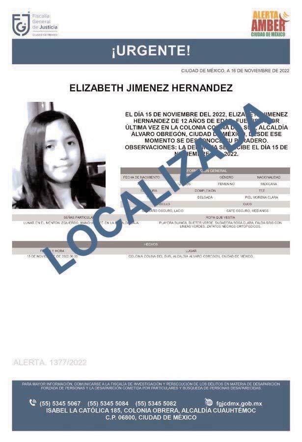 La menor desapareció el pasado 15 de noviembre en la colonia Corpus Christy, alcaldía Álvaro Obregón,por lo que sus padres acudieron en punto de las 10:50 de la mañana a instalaciones de la Fiscalía General de Justicia (FGJ CdMx),luego de entablar una conversación con la fiscal vía telefónica.