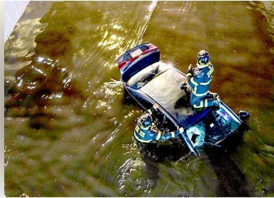 Un vehículo en el barrio la Españita fue arrastrado por la corriente, tras las fuertes lluvias registradas el lunes.