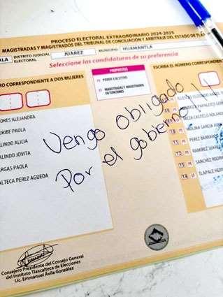 Finalmente, el conteo de votos para determinar quiénes ocuparán las cinco vacantes para juezas y jueces de distrito,no han iniciado, pero en los folletos, se pidió votar por los números 07,10,21,23,y 24,de los aspirantes Claudia Myriam Miranda Sánchez, Nataly Pérez Hernández, Juan Quintero Rojas, Carlos Alberto Rico Mondragón, y Salvador Rojas Belmont.
