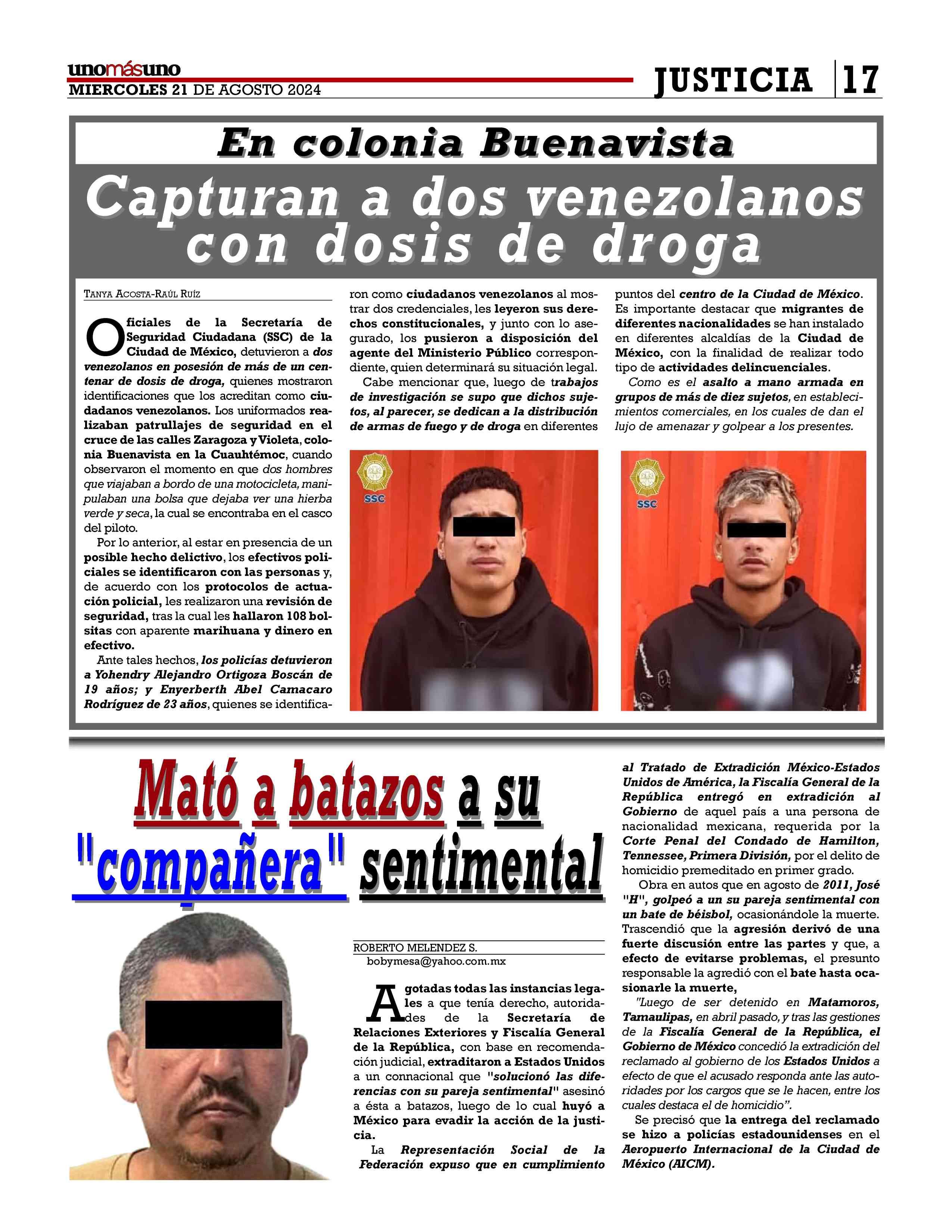 Se aseguraron 234 dosis, 96 bolsas y alrededor de 30 kilogramos de aparente marihuana; 842 dosis de una sustancia similar a la cocaína,cuatro dosis y aproximadamente 200 gramos de la droga conocida como cristal,un vehículo,una motocicleta y dinero en efectivo. También se realizaron 10 dispositivos de verificación de locales comerciales de venta de bebidas alcohólicas, en coordinación con autoridades de ambas alcaldías,lo que derivó en 45 apercibimientos,27 retiros de puestos semifijos y el decomiso de aproximadamente 500 kilos de envases y botellas.