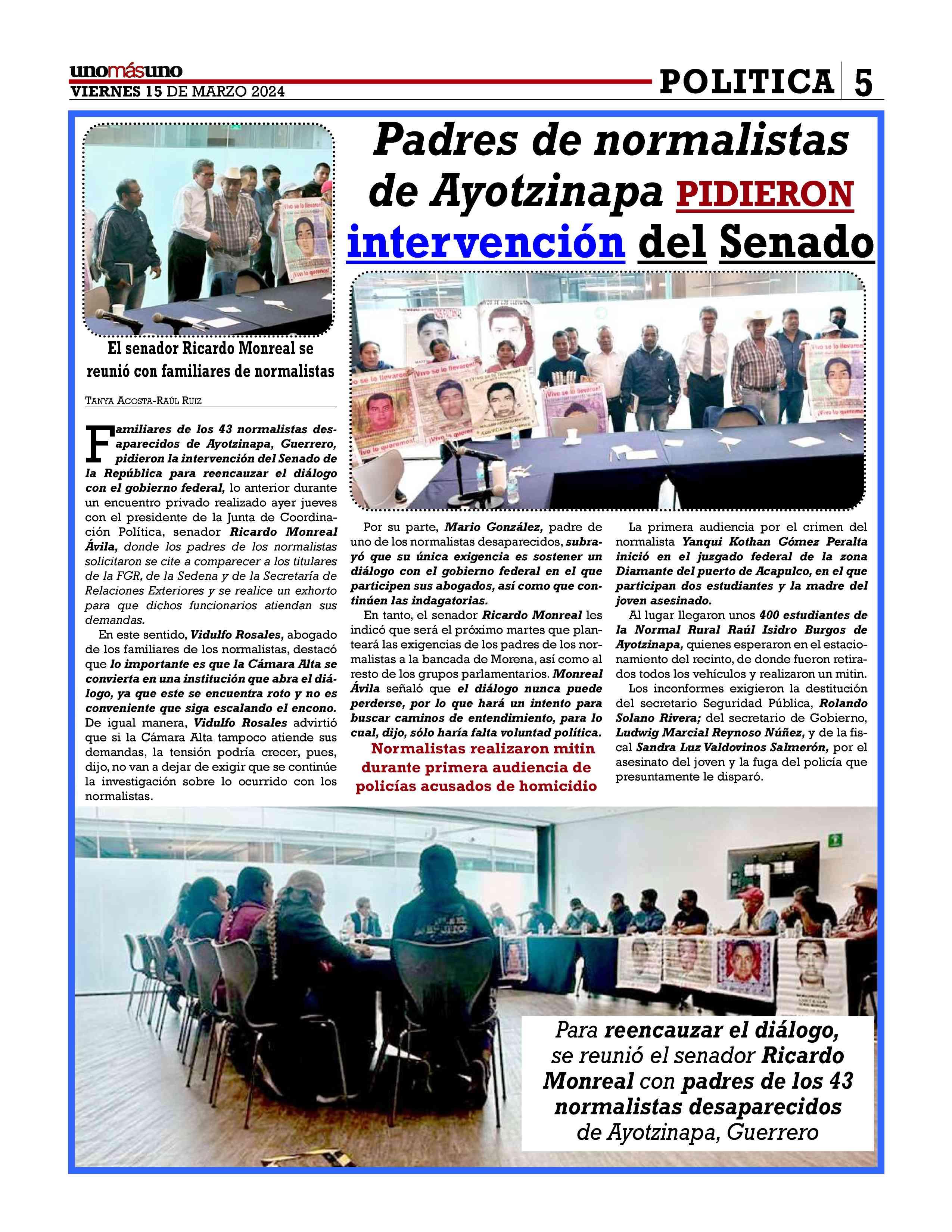 gación, pues se había afirmado que el joven normalista disparó en contra de los policías que lo asesinaron, hecho desmentido por las investigaciones de la Fiscalía General de la República.