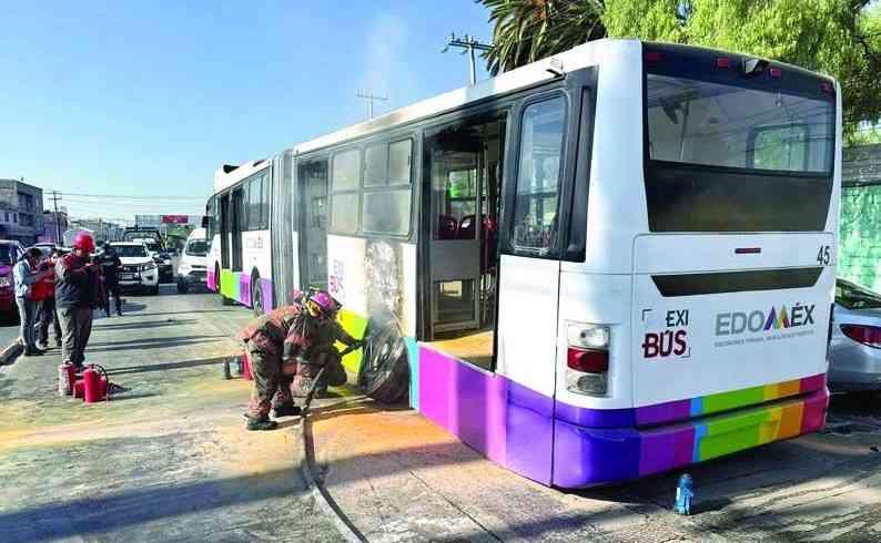 UnaunidaddelMexibús,que circulaba enel municipio de Ecatepec, se incendió en la parte de las llantas traseras del costado izquierdo sin que se reportaran personas heridas.