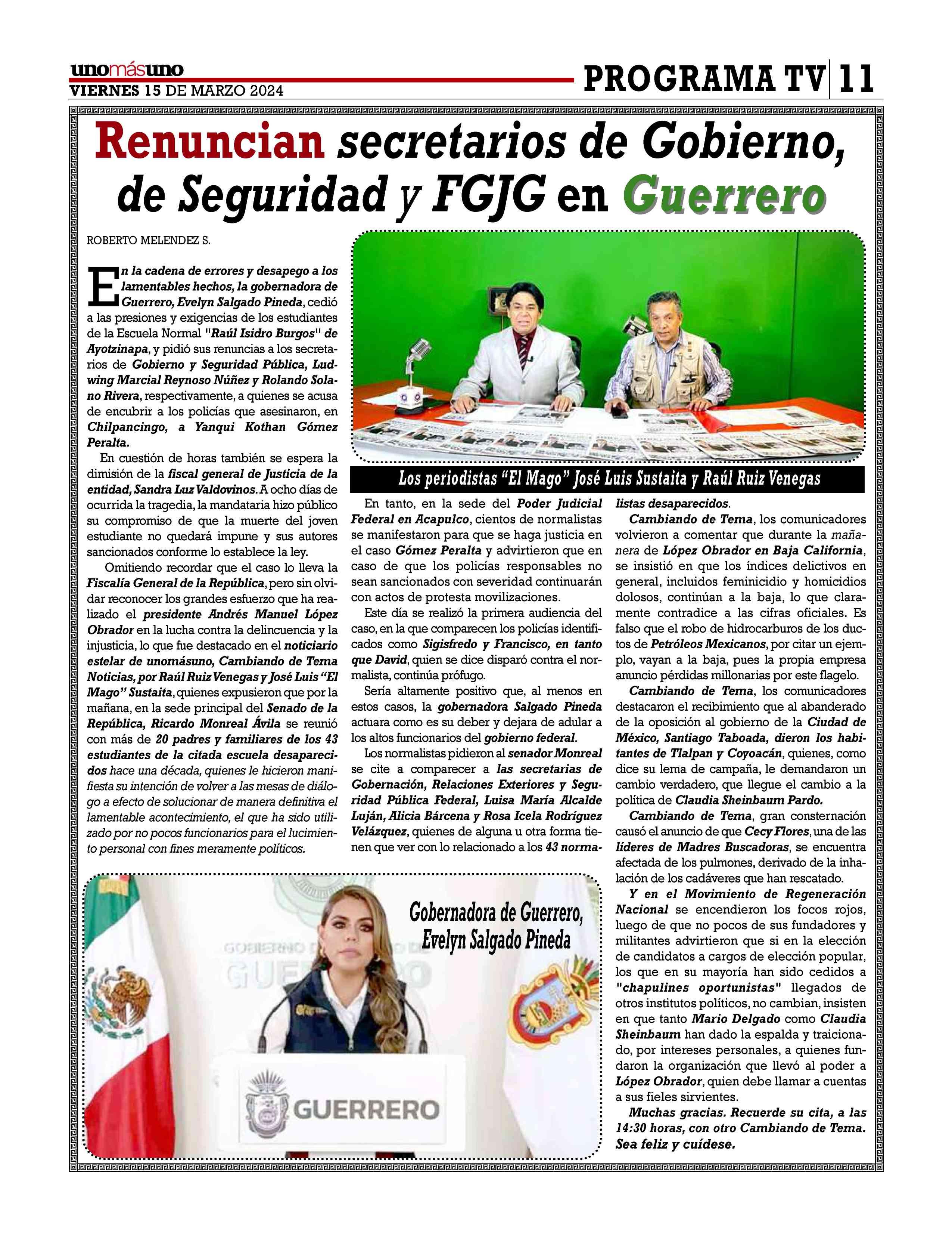 Evelyn Salgado Pineda, gobernadora de Guerrero, informó que los titulares de Gobierno de la entidad, Ludwig Marcial Reynoso, y de Seguridad Pública, el general Rolando Solano,presentaron su renuncia tras el asesinato del normalista Yanqui Kothan Gómez Peralta por parte de un agente de la Policía estatal.