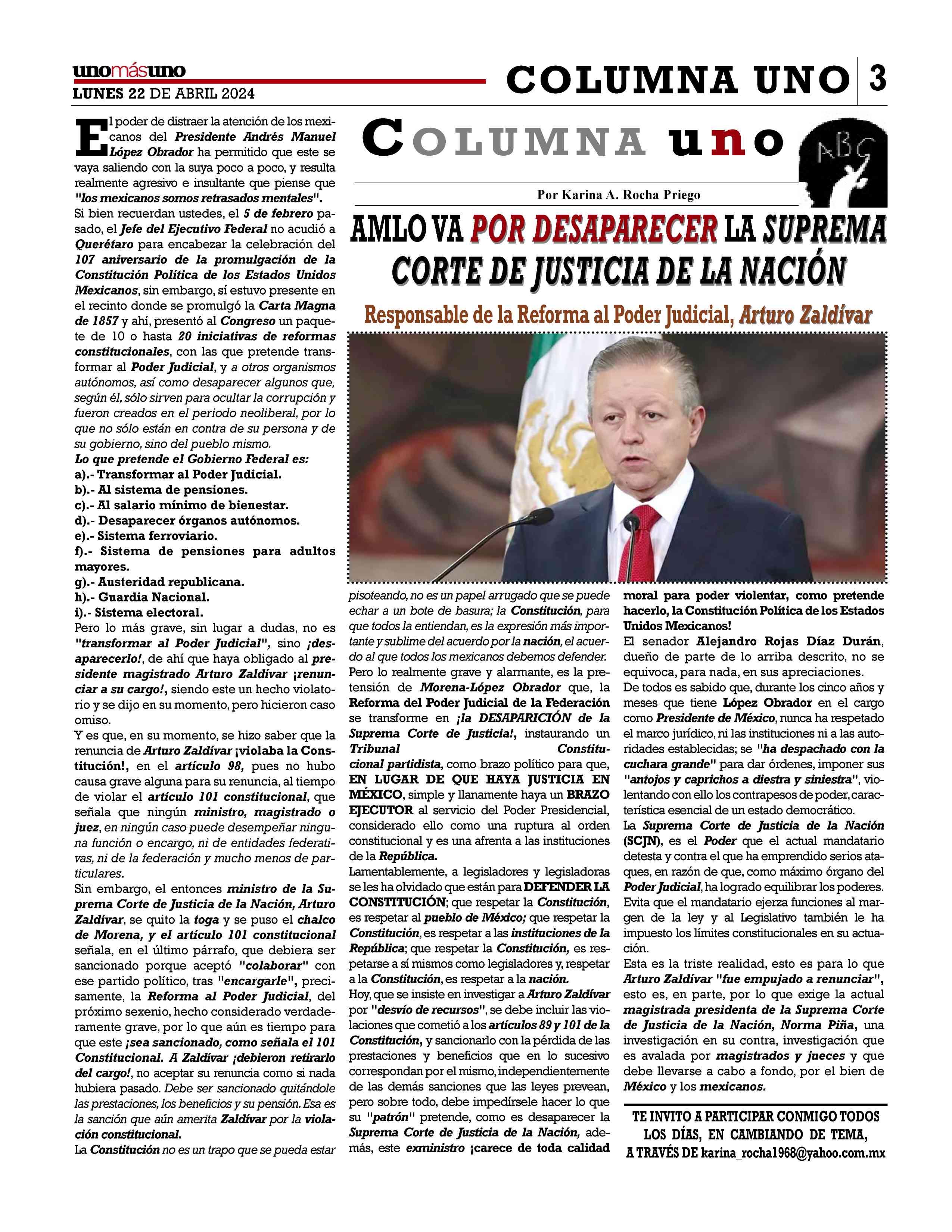 AñoXLV-Número16142Lunes22deabril2024 UNOMÁSUNONACIONAL.EditorResponsable:NAIM LIBIENKAUI.Publicacióndiaria,editadaydistribuidaporLIBIEN &SON’SSAdeCVentalleresdeGabinoBarreda86bis.Col.San Rafael,CiudaddeMéxico,C.P.06470,DelegaciónCuauhtémoc TeléfonoCDMX:55/10555500.Ext.Redacción102-103y105, PlantaToluca017221340000Ext.116. Losartículosynotaspublicadosenesta edición,sonresponsabilidaddequienlosfirma.