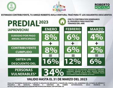 yente Cumplido se aplicará 8,6,y 2% en materia del pago de predial 2023; considerando que para el grupo vulnerable,podría tener un descuento hasta del 34 %,de acuerdo a lo establecido por la autoridad. En lo que respecta al pago en servicios de Agua Potable,Red de Drenaje,y Saneamiento 2023,se informa que podrán tener descuentos del 8,6,y 4 %,en pagos realizados en los meses de Enero,Febrero y Marzo, respectivamente,en Pago Anual Anticipado. Y para Contribuyente Cumplido, en el mismo rubro de pago en servicios de Agua Potable,Red de Drenaje,y