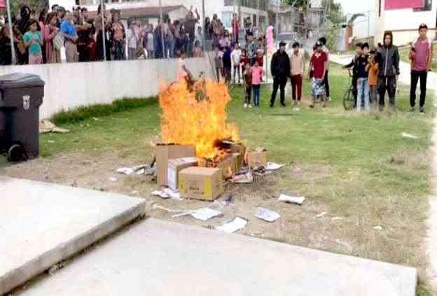 Así es como padres de familia de la Escuela Primaria "Benito Juárez García" delacomunidadSanAntoniodelMonteen SanCristóbaldelasCasas,Chiapas;tomaronladecisióndequemarloslibrosdetexto gratuitos que envió la Secretaría de Educación Pública (SEP).