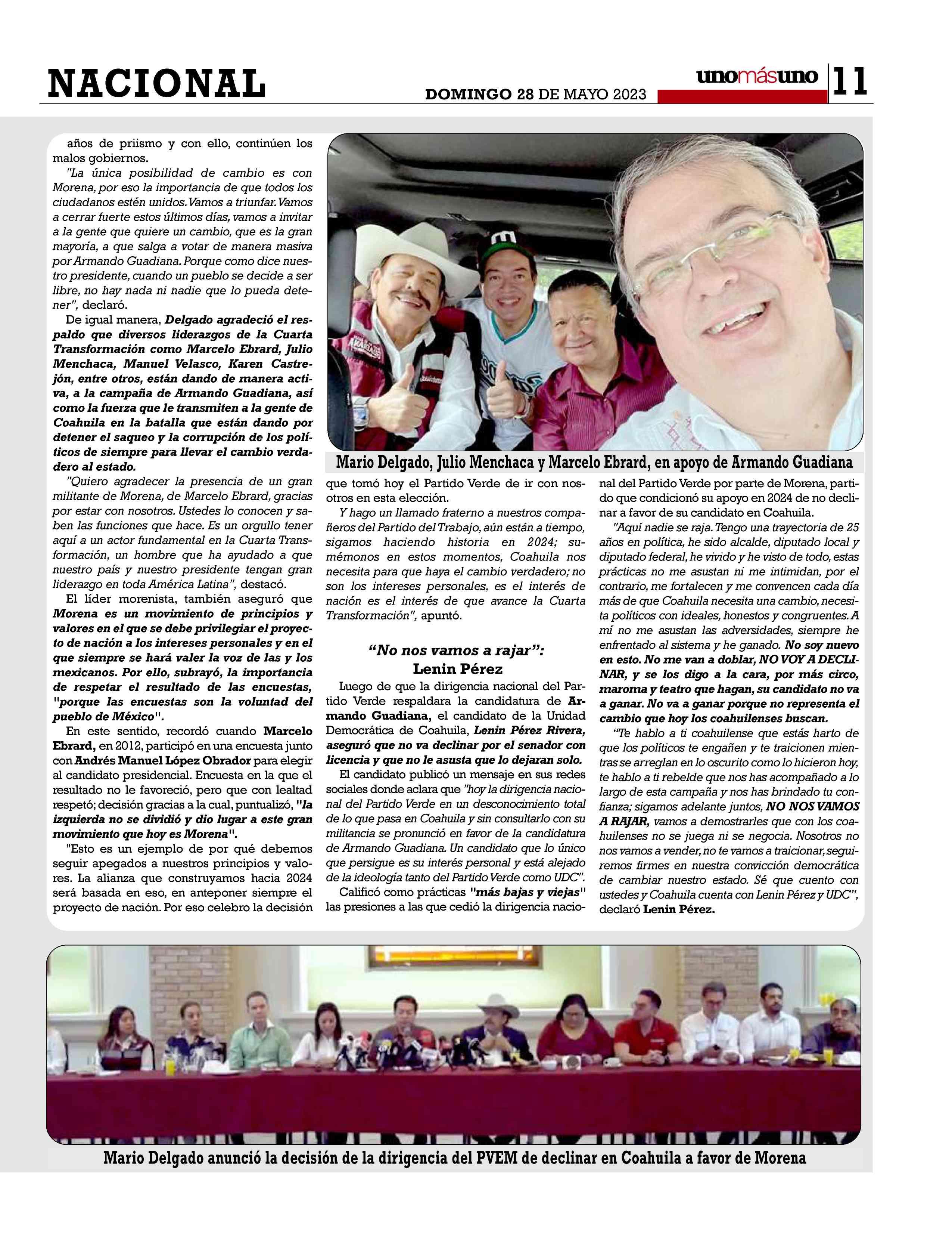 Rumboalúltimofindesemanadecampañas,antesdelaseleccioneslocalesenCoahuilayestadodeMéxico,ellíderde Morena,MarioDelgado,llamóunavezmásaPTyPVEMa sumarsealacandidaturadeArmandoGuadiana,yhastales ofrecióformarungobiernotripartita,conGuadianaalacabeza.