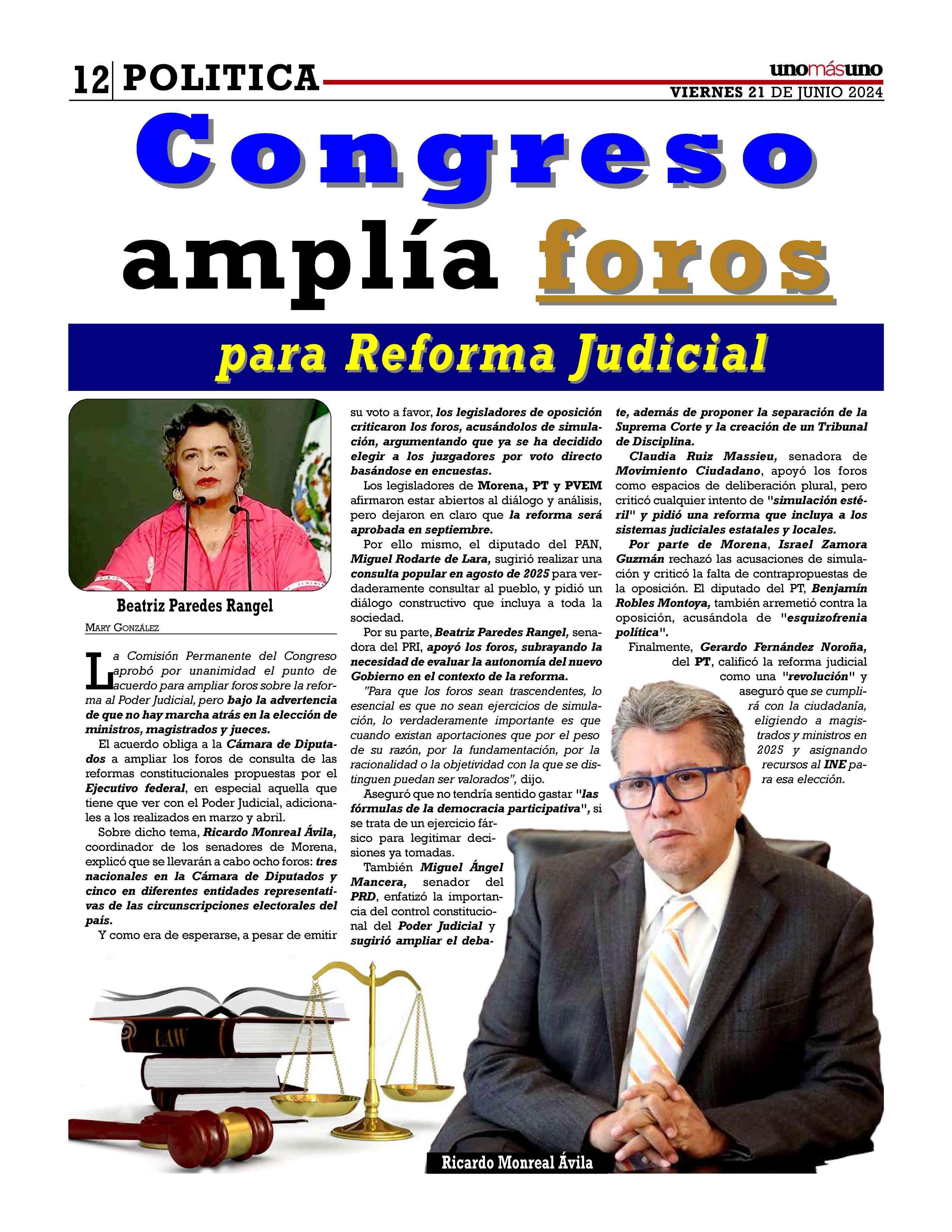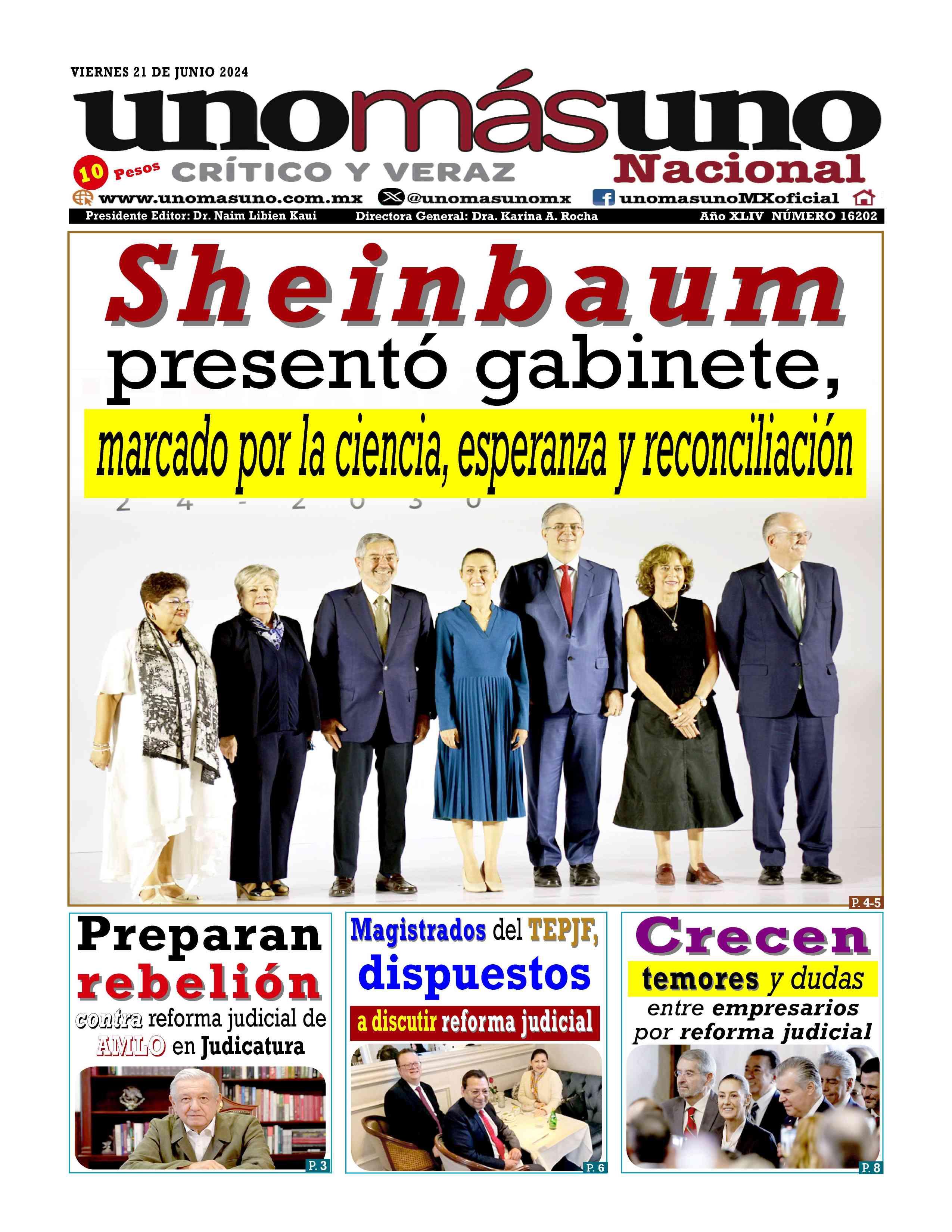 AñoXLV-Número16202Viernes21dejunio2024 UNOMÁSUNONACIONAL.EditorResponsable:NAIM LIBIENKAUI.Publicacióndiaria,editadaydistribuidaporLIBIEN &SON’SSAdeCVentalleresdeGabinoBarreda86bis.Col.San Rafael,CiudaddeMéxico,C.P.06470,DelegaciónCuauhtémoc TeléfonoCDMX:55/10555500.Ext.Redacción102-103y105, PlantaToluca017221340000Ext.116. Losartículosynotaspublicadosenesta edición,sonresponsabilidaddequienlosfirma.