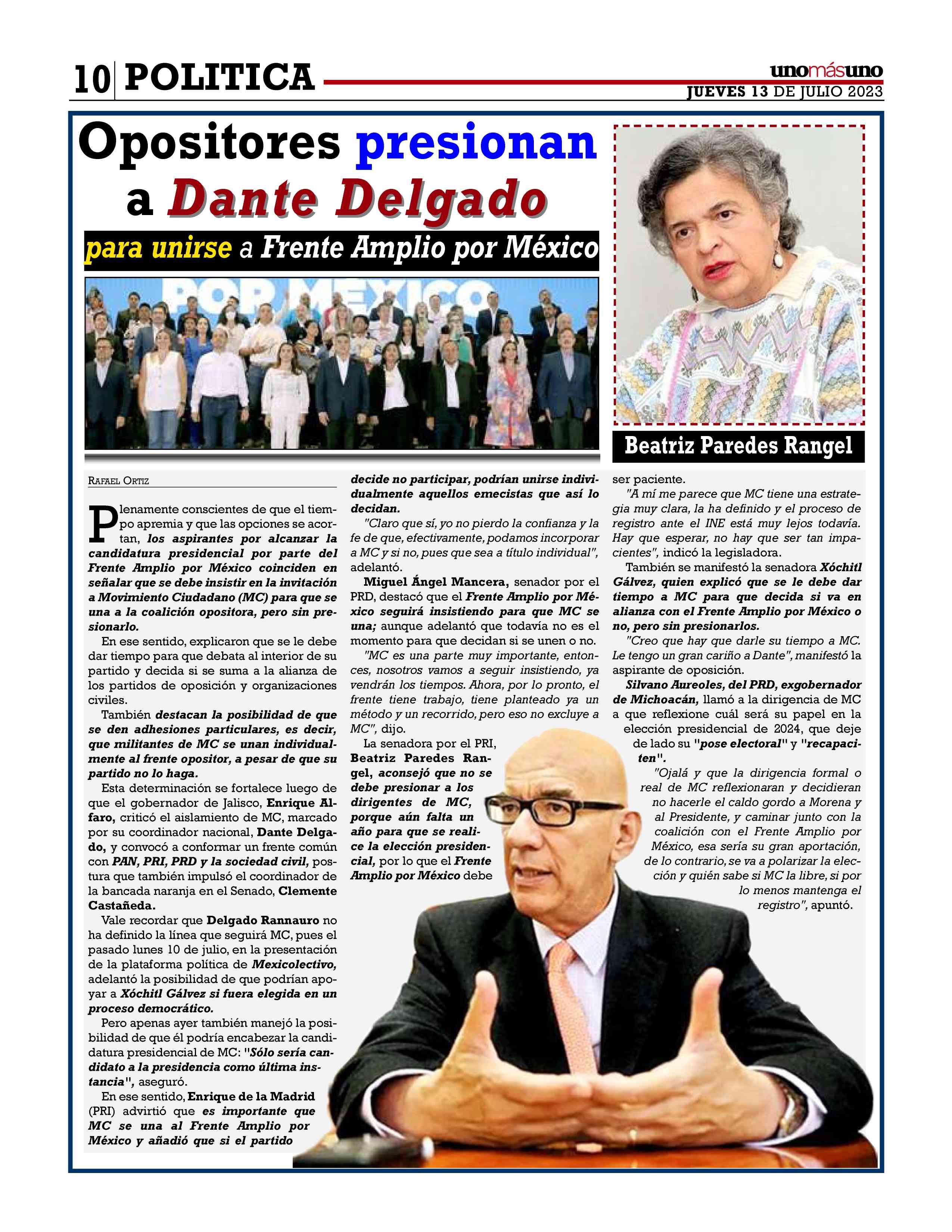 Pesos JUEVES13DEJULIO2023 DirectoraGeneral:Dra.KarinaA.RochaAñoXLIVNÚMERO15861 PresidenteEditor:Dr.NaimLibienKaui 5 P. 4 P. 7 P. 10 Opositorespresionan aDanteDelgado DanteDelgado paraunirseaFrenteAmplioporMéxico Gobierno privatiza privatiza servicios médicosP.6