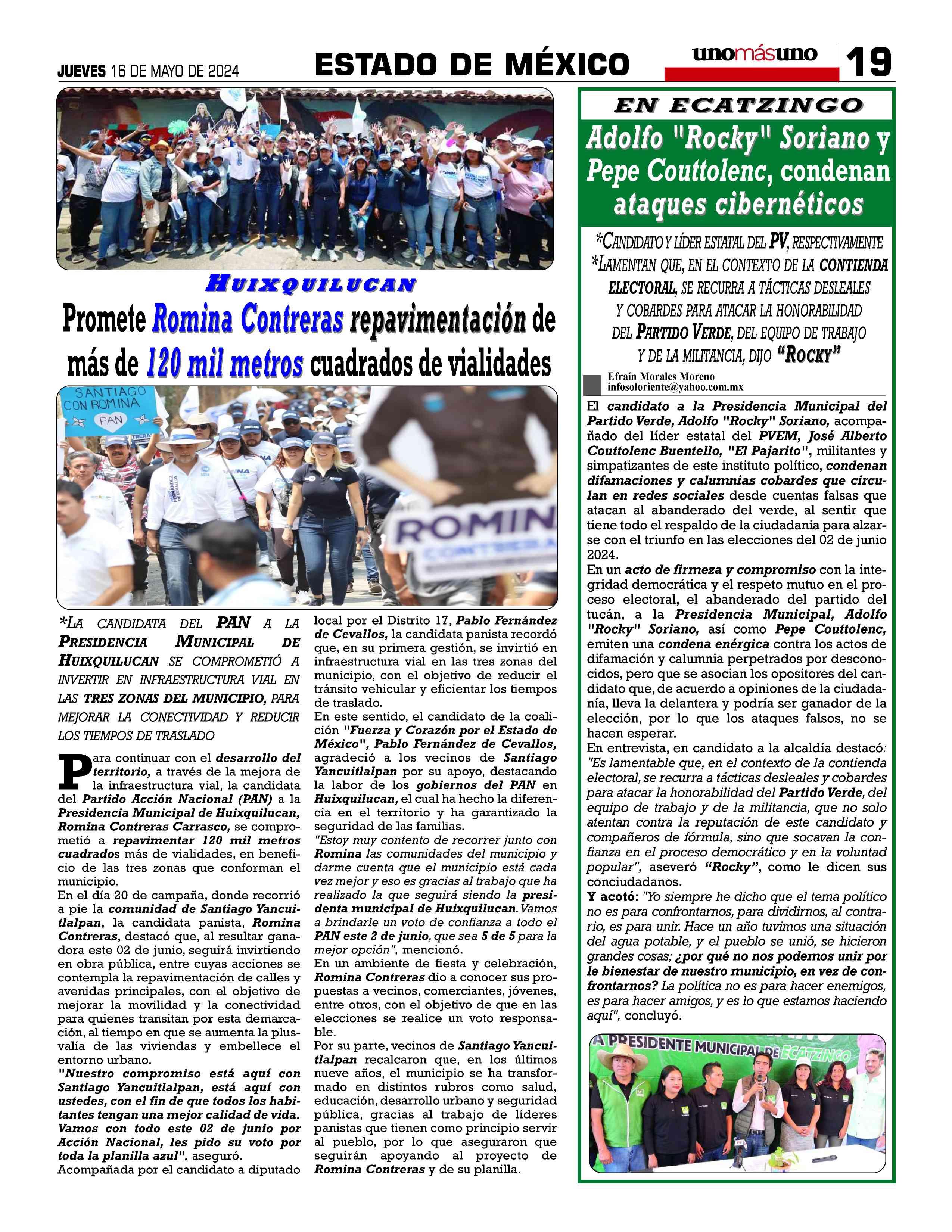 AñoXLV-Número16166Jueves16demayo2024 UNOMÁSUNONACIONAL.EditorResponsable:NAIM LIBIENKAUI.Publicacióndiaria,editadaydistribuidaporLIBIEN &SON’SSAdeCVentalleresdeGabinoBarreda86bis.Col.San Rafael,CiudaddeMéxico,C.P.06470,DelegaciónCuauhtémoc TeléfonoCDMX:55/10555500.Ext.Redacción102-103y105, PlantaToluca017221340000Ext.116. Losartículosynotaspublicadosenesta edición,sonresponsabilidaddequienlosfirma.