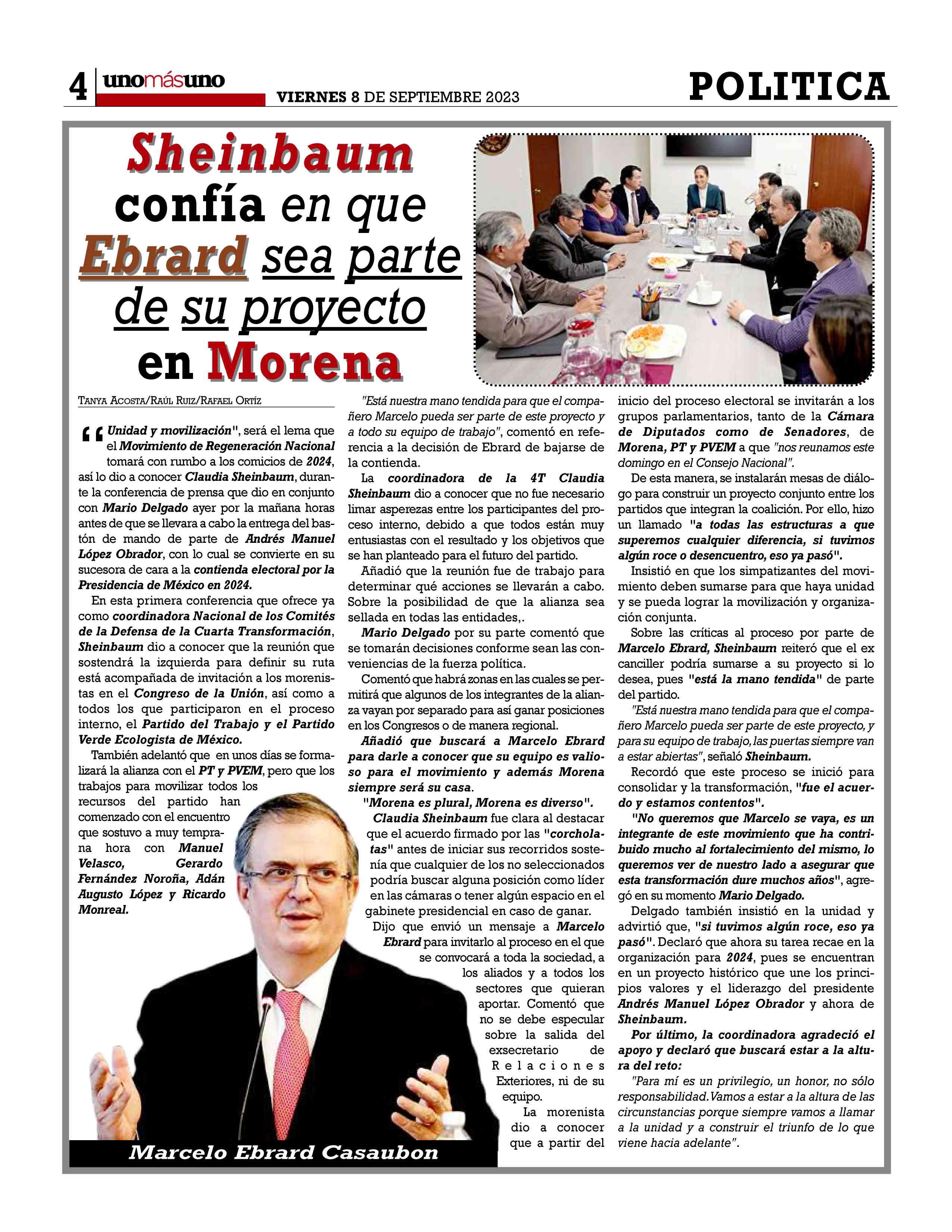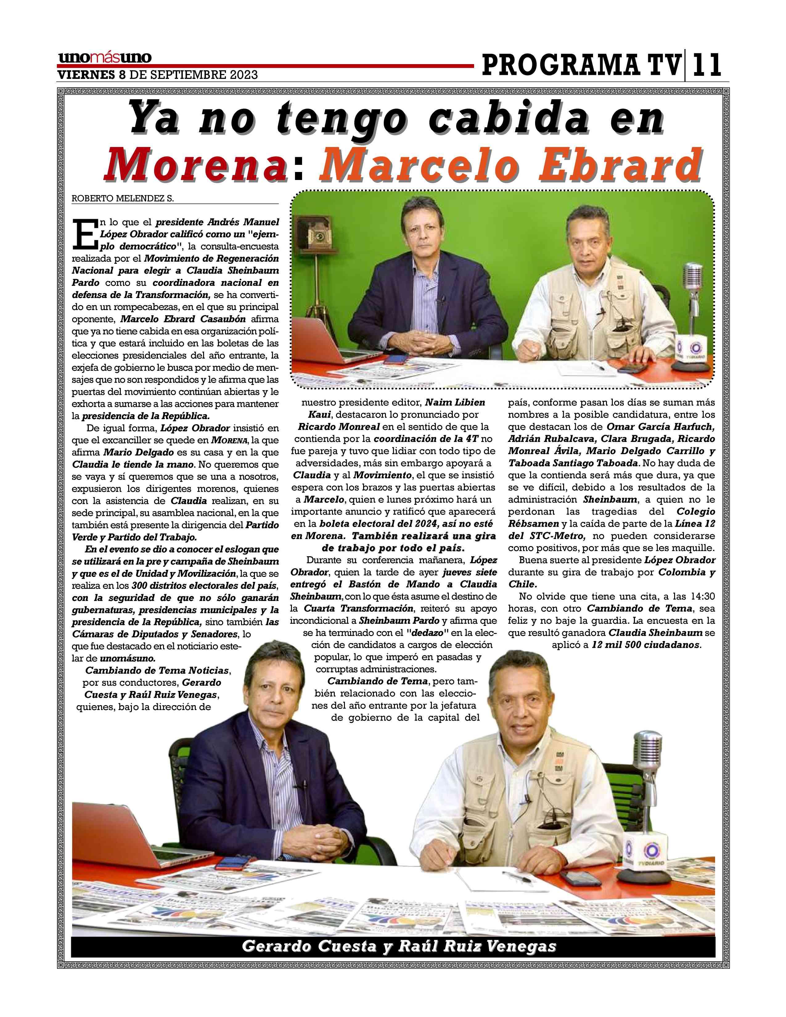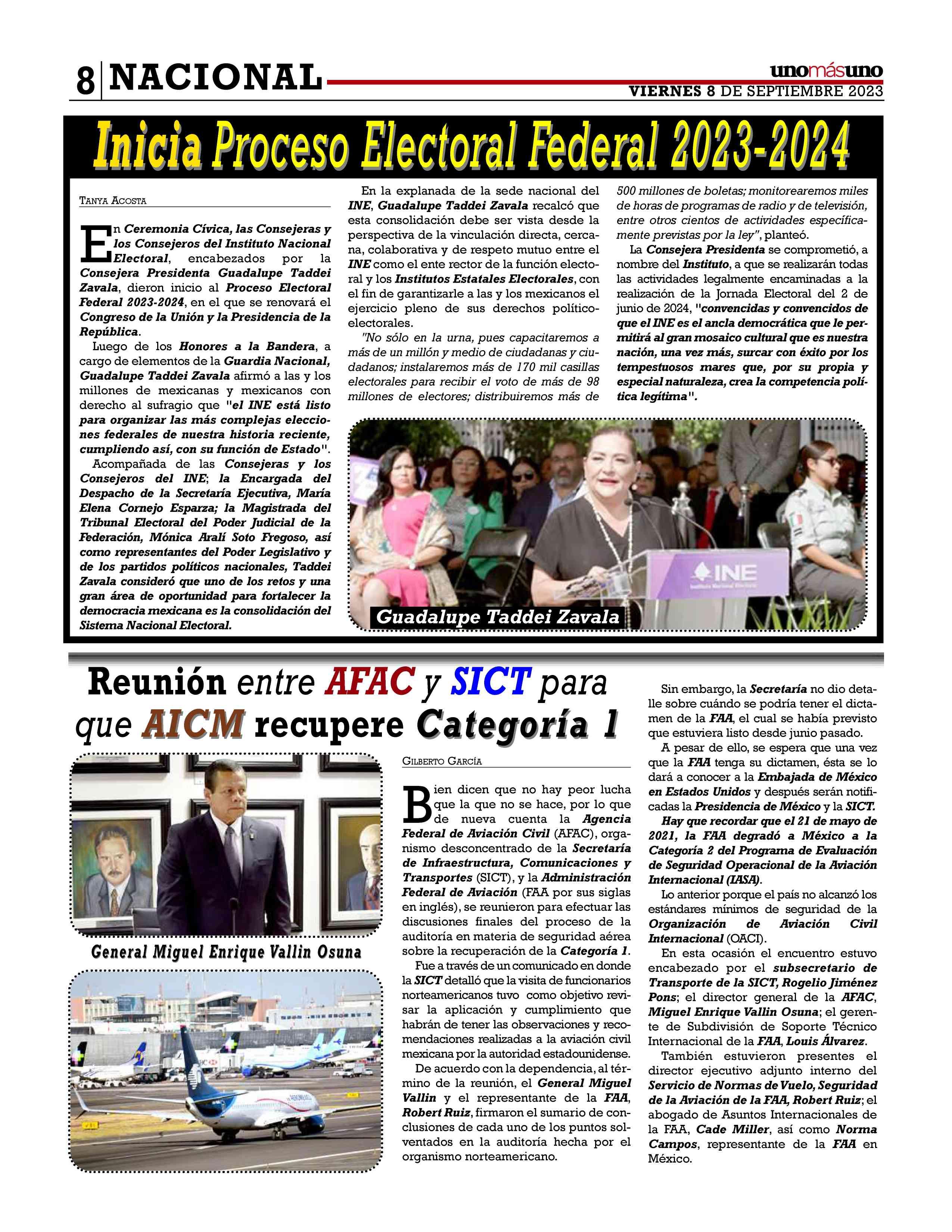 AñoXLV-Número15920Viernes8deseptiembre2023 UNOMÁSUNONACIONALunapublicacióndiaria,editada ydistribuidaporArrendadoraMultiusos,S.A.deC.V. entalleresdeGabinoBarreda86bis.Col.SanRafael,Ciudad deMéxico,C.P.06470,DelegaciónCuauhtémoc TeléfonoCDMX:55/10555500.Ext.Redacción102-103y105, PlantaToluca017221340000Ext.116.