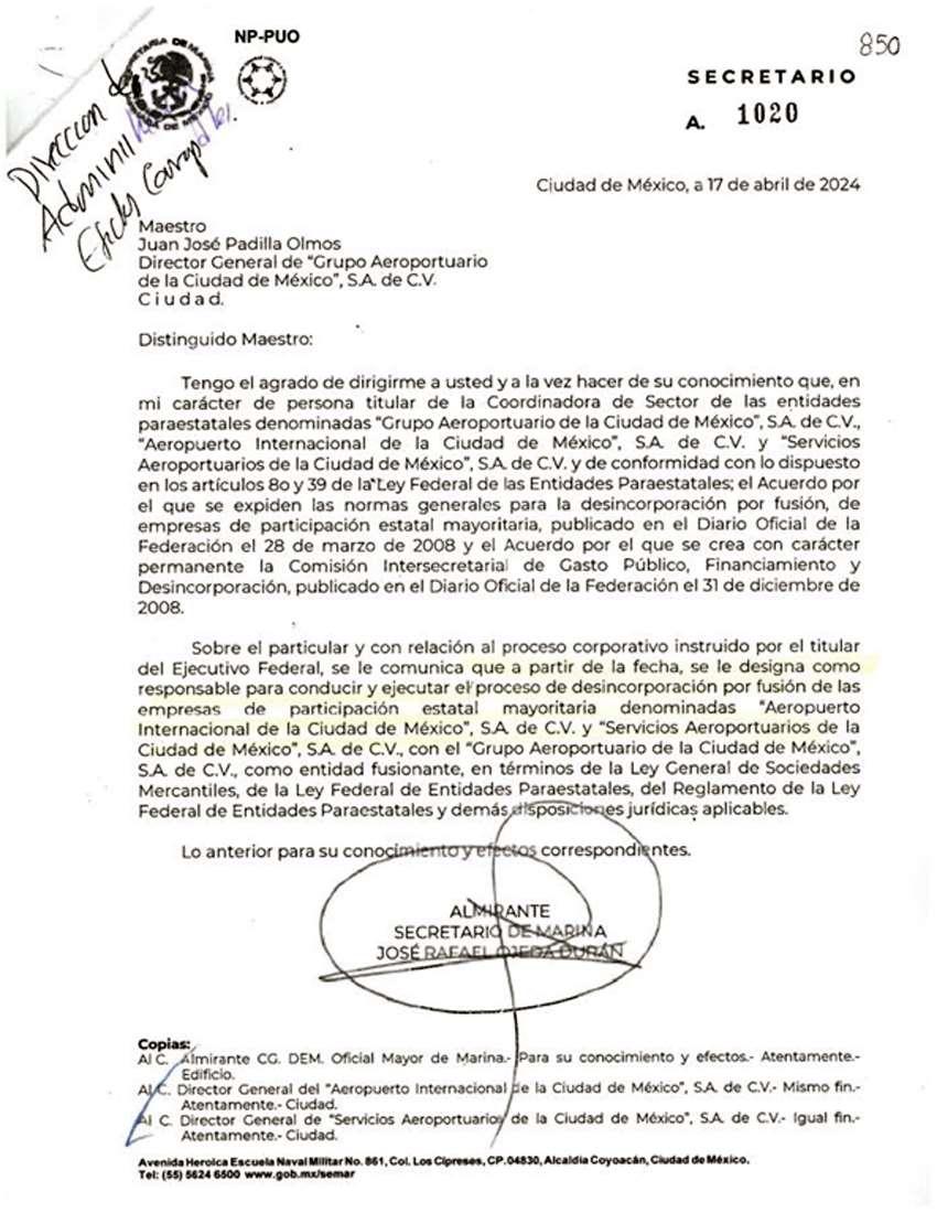 A través de un oficio, el secretario de Marina, José Rafael Ojeda Durán, designó al director del Grupo Aeroportuario de la Ciudad de México (GACM), JuanJoséPadillaOlmos, como responsable de ejecutar la fusión.