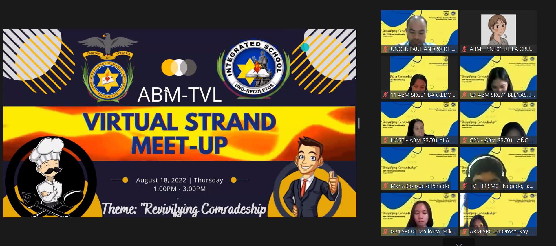JUNIORS MEET SENIORS. Jampacked with students from Grades 11 & 12, the University of Negros Occidental - Recoletos Senior High School strands initiated its annual Strand Virtual Meet-up via Zoom, August 18, 2022.