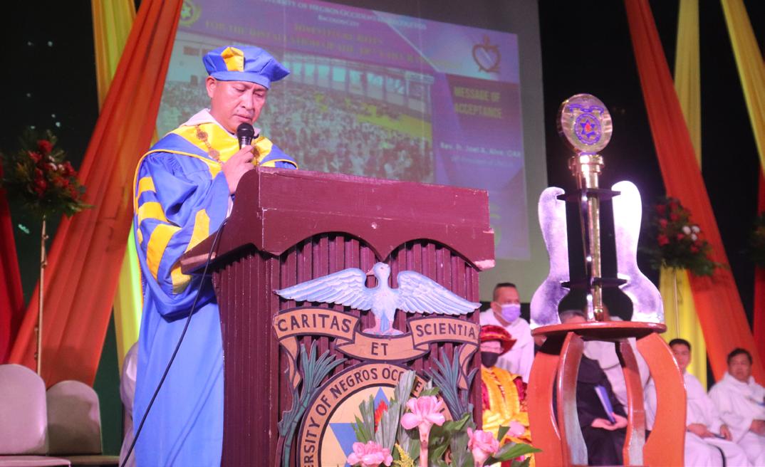 ANOTHER ERA. Rev. Fr. Joel Alve OAR delivers his Message of Acceptance following his inauguration as the 18th President of the University of Negros Occidental - Recoletos during the Investiture Rites held at the University Gymnasium last August 31.