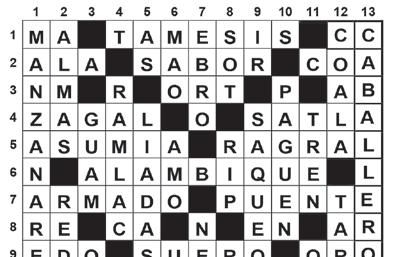 1.- Relativo al país de que se trata. /2.- Planta aromática cuyas semillas se usan en confitería y licorería – Dar anuncio, proclamar, dar a conocer. /3.- (Inv) Ingreso anual – 101 en números romanos. /4.- Pelo de la cola y cuello de los caballos. –Adv que indica un lugar cercano al hablante. – (Inv) Color que surge de la mezcla del blanco y el negro. /5.- Dícese del tema musical que se convierte en éxito. En beisbol: batazo efectivo, - (Inv) poesía rimada no escrita en prosa. /6.- Ajustado a la verdad. – Construcción ligera de palos y palmas usada con fines recreativos. /8.- Terminación del infinitivo. –Símbolo del sodio. –Categoría del beisbol. /9.- Linaje, ralea. Grupo de individuos que comparten características físicas hereditarias. – Abreviatura de zoológico. – Expresión que expresa aflicción, dolor, quejido o suspiro. /10.- Existe. – Extrae, lleva al exterior. (Inv) Símbolo del radón. –Símbolo del molibdeno. /11.- Cubierta extensible de lona para dar sombra. – Letra griega. /12.- Compromiso de realizar algo o contraer una obligación. –Esparzo, derramo, doy agua al cultivo. – (Ven) /13.- Postre hecho de maíz, coco y papelón (Pl)