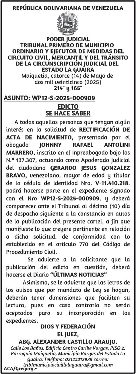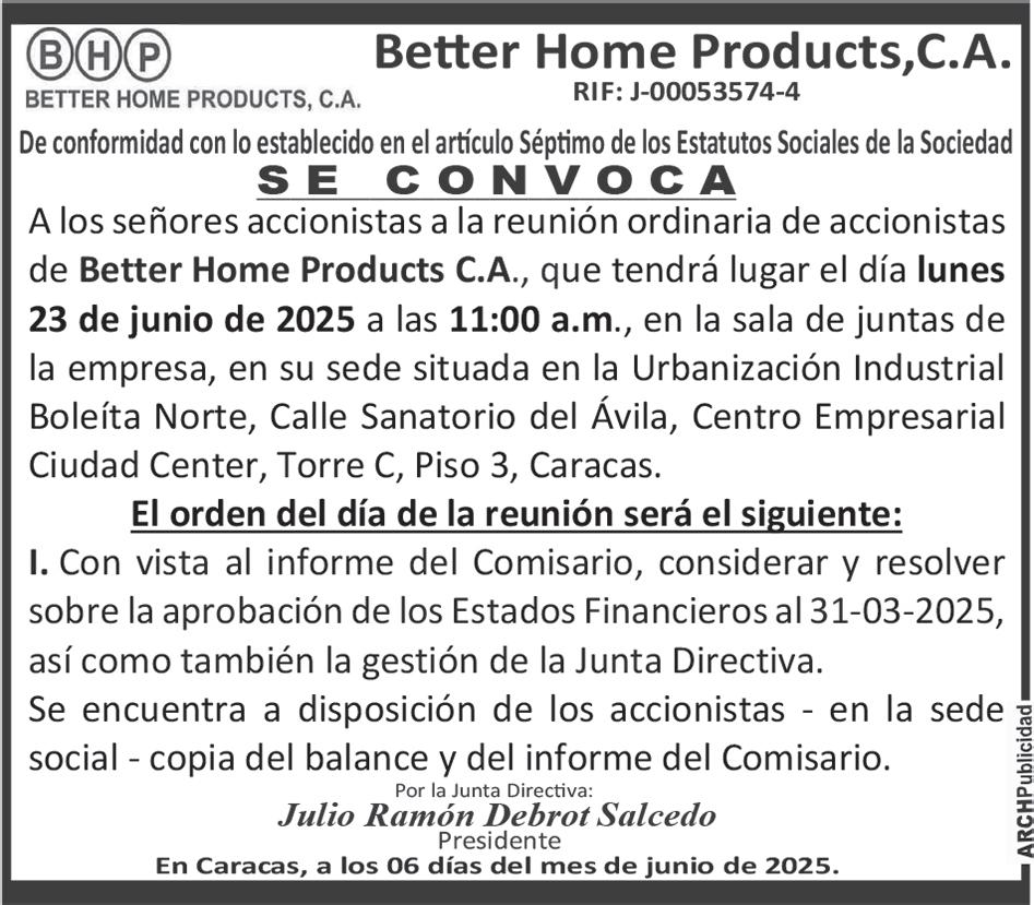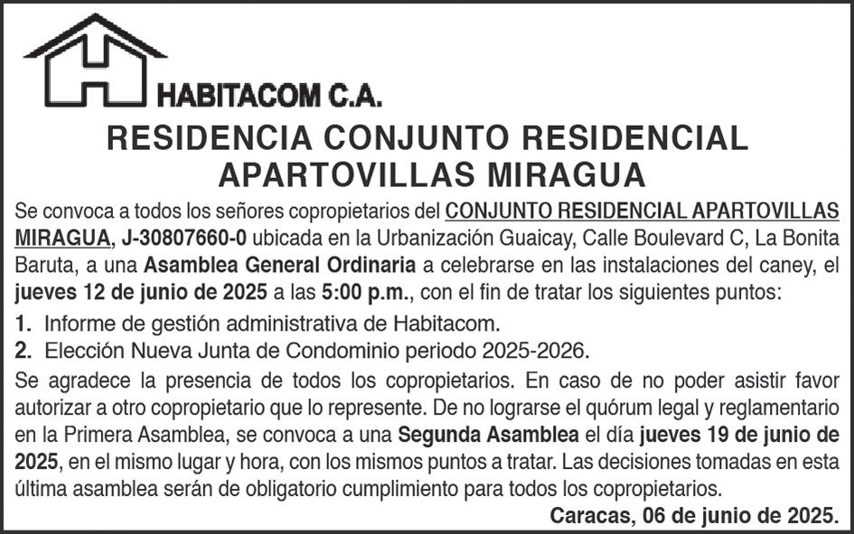 Se convoca a los señores accionistas para la Asamblea General Extraordinaria de Accionistas, que se celebrará el día viernes 13 de junio de 2025, a las 9:00 a.m., en la sede social de compañía, ubicada en la calle Panamá con Av. Libertador, Edificio Lidomar Plaza, nivel Mezzanina, oficina 8, Urbanización Los Caobos, Parroquia El Recreo, en la ciudad de Caracas-Venezuela, a objeto de considerar y resolver los puntos contenidos en la siguiente agenda: PRIMER PUNTO: Ratificación plena del contenido del Acta de Asamblea General Extraordinaria de fecha 09 de junio de 2021. SEGUNDO