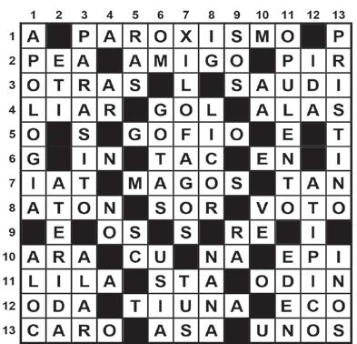 1.-(Ven) Plato hervido realizado con verduras, panza y pata de res. –Prefijo que colocado delante de una unidad de medida la multiplica por 10¹². /2.- Aleación de hierro y carbono de alta resistencia. –Contracción gramatical. – (Inv) Sentimiento de tristeza, castigo, dolor, sufrimiento. /3.- (Ven) Hombres rubios. – (Inv) Elemento de número atómico 3 y símbolo Li. /4.- Río de Rusia que nace en los montes del mismo nombre y desemboca en el mar Caspio. – Abreviatura de litros. – Hembra del mono. /5.- Tasa interna de retorno (siglas). –Observe, mire. – (Inv) Relativo a la zona. /6.- Organización no Gubernamental (siglas) – Preso, condenado. /7.- Universidad Central de Venezuela (siglas) –Manada de cerdos. /8.- (Inv) Perdías la vertical, ibas al suelo por tu propio peso. – (Inv) Hermana de uno de los padres. /9.- Copla canaria. – Yoko ____, esposa de Lennon. – (Inv) Símbolo del calcio. – El sol entre los egipcios. /10.- Según la filosofía china, fuerza cósmica indisoluble unida al yin y al tao que representa la pasividad. – (Inv) Escuela Práctica de Agricultura (siglas) – (Inv) Cabello. /11.- Juntaban, pegaban. – (Inv) Demuestra alegría con la risa. – Onda marina. /12.- Unidad monetaria de la República Popular de China. - En francés Y. – Sacar algo al sol para ventilarlo y desodorizarlo. /13.- (Inv) Este no. Uno diferente del que se habla. – (Ven) Dícese del animal, persona o cosa sin dueño, que va sin destino fijo.
