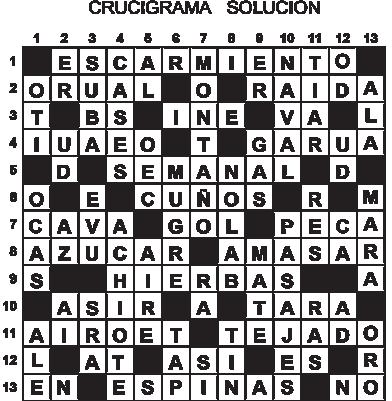 1.- Que comunica, /2.- 101 en números romanos. – Hacer campamento. Dormir al aire libre. – Antes meridiem (siglas). /3.- Quiere adora. – Raja de leña para alumbrar. /4.- Abreviatura de nacional. – (Inv) Cortar árboles por el pie. –Autopista Regional del Centro (siglas). /5.- Molino para extraer el jugo de la caña (Pl). /6. (Inv.) Prefijo que significa muchos. –Oficina Central de Información (siglas). – Perder la vertical. /7.- Símbolo del molibdeno. – Pasadas por un molino. – Siglas de Sociedad Anónima. /8.- Hace surcos con el arado. – Apócope de motocicletas. – Enroque largo. /9.- Sacerdote católico. – (Inv) Limpia el grano en el pilón. /10.- (Inv) Posición del yoga (Pl). – (Inv) De color del oro (Fem) /11.- Dícese del vehículo diseñado para grandes velocidades (Pl). /12.- Asistente de campo del jugador de golf. – Organización separatista vasca. –Tiempo transcurrido desde el nacimiento de una persona. /13.- Símbolo del osmio. – Producir cambios, alteraciones. –Símbolo del sodio.