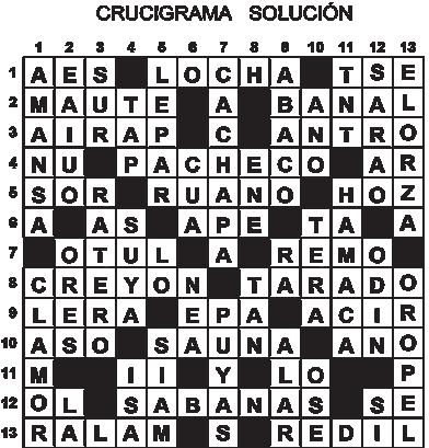 1.- Infusión de hierbas, bebida aromática. –Planta bromeliácea de la cual se fabrican chinchorros en la población de Aguasay del estado Monagas. – Símbolo del Tulio. /2.- Impuesto al valor agregado (siglas). –Sentir celos. – Cauce de agua. /3. Del color de la nieve (fem). –(Inv) Paso ligero del caballo. /4.- Amarre, inmovilice con cuerdas. – (Ven) Prenda de vestir enteriza usada por mecánicos y otros trabajadores. – Prefijo que significa provecho. /5.- Onomatopeya de la risa. – Extremidad de las aves. –49 en números romanos. /6.- Pinzas del cirujano. – Volví a caer. /7.- Símbolo del calcio. – Fruto de la vid. – Apócope de suyo. /8.- (Inv) Capacidad estimada de un recinto público. – Paz, quietud, sosiego. /9.- Santa patrona de Cumaná. – Cada una de las actividades creativas del hombre. /10.- Dio utilidad, utilizó. –Transportar algo hasta este lugar. – Ánade, ganso. /11.- Símbolo del tantalio. – Letra griega equivalente a la Te latina. – Aire musical de origen cubano. –Voz de mando militar. /12.- Símbolo del oro. –Abreviatura de satelital. – Terminación de los alcoholes. /13.- Lirio heráldico. – Recipiente de madera para pisar o prensar uvas u olivas. –Metal precioso.