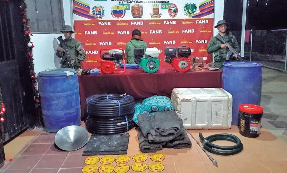 Según informó el jefe del Comando Estratégico Operacional de la Fanb, Domingo Hernández Lárez, en el operativo realizado en el marco de la Operación Escudo Bolivariano Neblina 2025, fueron incautados motores de succión de agua, rotores e impeler para motor a gasolina, alfombras usadas como