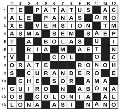 esencial, capital. – Diosa egipcia de la guerra. /3.- Símbolo del sodio. – Artículo neutro. – Río de Suiza. – Siglas de computador personal. – /4.- Símbolo del calcio. – Apócope de motocicleta. – (Inv) Se desploma, pierde la vertical. /5.- Siglas de compañía anónima. –(Inv) Hipocorístico de Francisco. – Amarra con cuerdas. /6.- Persigue sin dar tregua. – (Inv) Repetido padre. –Membrana coloreada del ojo. /7.- Célebre músico y compositor margariteño, director del Quinteto Contrapunto. /6.Testarudo, pertinaz, obstinado. – Asistir. – (Inv) Escrito breve. /9.- Terminación del infinitivo. – Desmenuzar finamente con los dientes. – Santa madre de la Virgen María. /10.- Símbolo del lutecio. – (Inv) Residuo del pilado del maíz utilizado como alimento animal. – Plural de una vocal. /11.- (Inv) Símbolo del plomo. –(Inv) Entrega, otorga, cede. – Memoria modificable de las computadoras. – Nota musical. /12.- Creador virtuoso, artista artesano. – (Inv) En la poesía, poeta. /13.- Rastrero, sumiso, adulador. – Género teatral que hace críticas mediante la ironía y el sarcasmo.