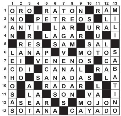 aprecio. – Baraja con el número uno. /2.- (Inv) Zarcillo, pendiente. – Sube, lleva a una posición superior. /3.- Lirio heráldico. –(Ven) Prenda de vestir enteriza que cubre tronco, brazos y piernas. – Demuestra alegría con la risa. /4.- Prefijo que significa “falta o ausencia de “– Séptimo planeta del sistema solar. – (Inv) Vestidura talar de los magistrados y graduandos. /5.- Nacidos de indio y negra o vs. – Parte posterior del pie humano. /6.- Instrumentos para la defensa y el ataque. - _____ Melao. Planta forrajera de la familia de las gramíneas. /7.- Apócope de suyo. – Célebre fabulista griego. /8.- (Inv) Contenido escrito de una obra literaria. – (Inv) Movimiento periódico de subida y bajada del nivel del mar causado por la atracción del Sol y la Luna. /9.- Embarcaciones, barcos. – Furia, enojo, ira. /10.- Ciudad de Caldea, patria de Abraham. – hijo de uno de los tíos. – (Inv) Cofre, baúl. /11.- Abreviatura de estado. – Puesta de un astro. – Orquesta Típica Nacional (siglas). /12.- Miraras, observaras. – Anhela, quiere. /13.- Animal plantígrado (Pl). – Relativo al quehacer del hombre en cuanto al bien y al mal. Ético. –Símbolo del escandio.