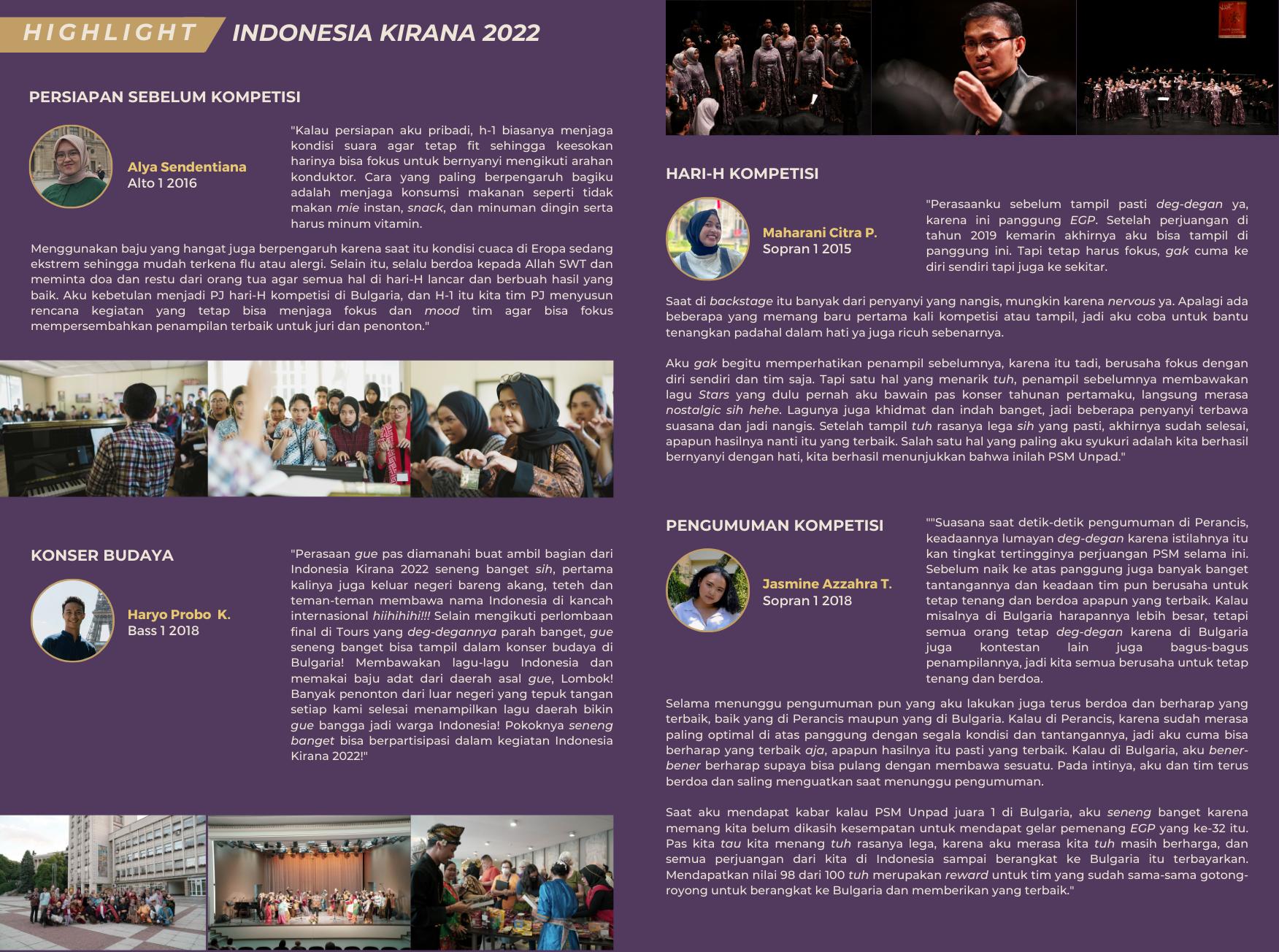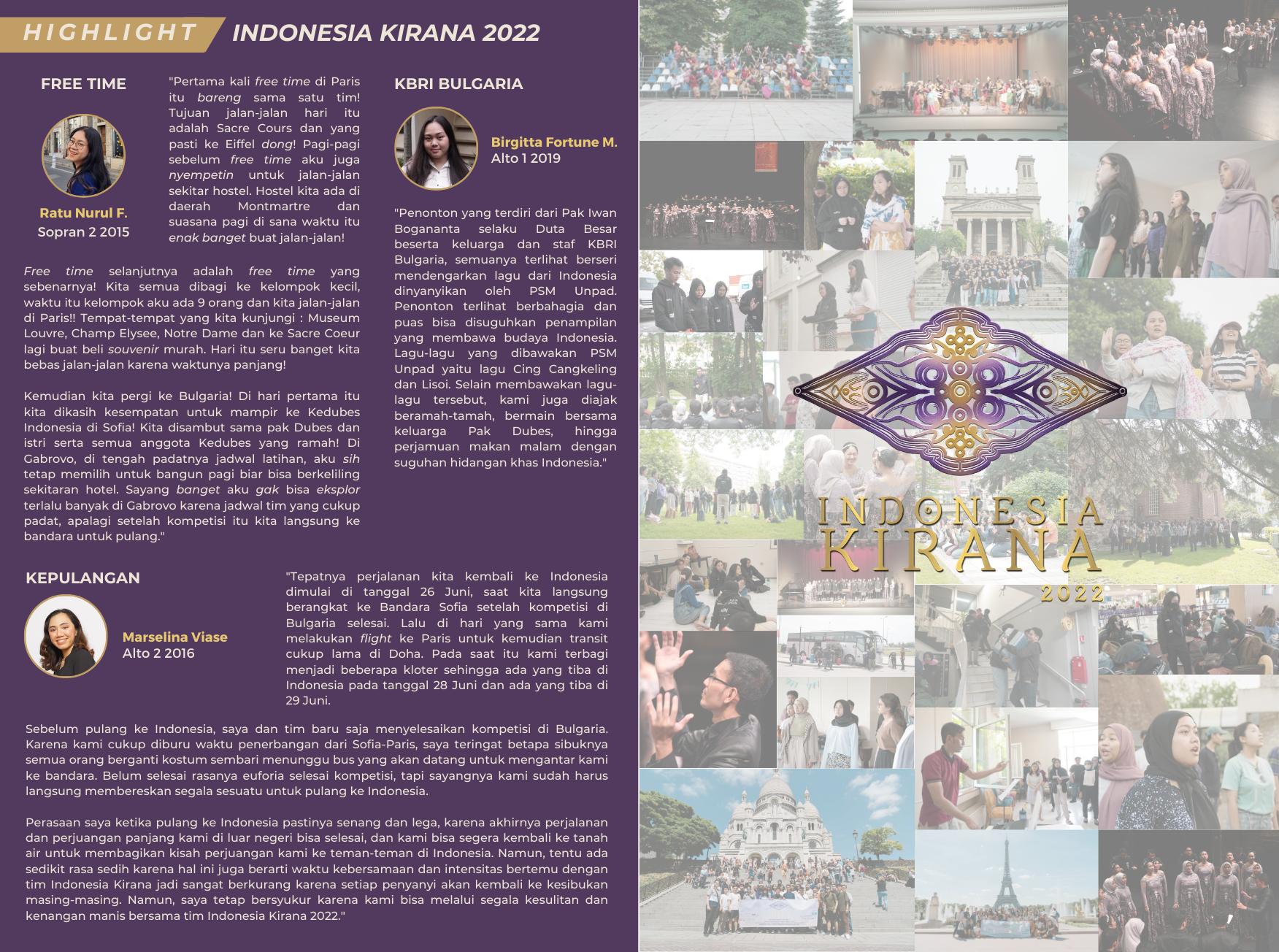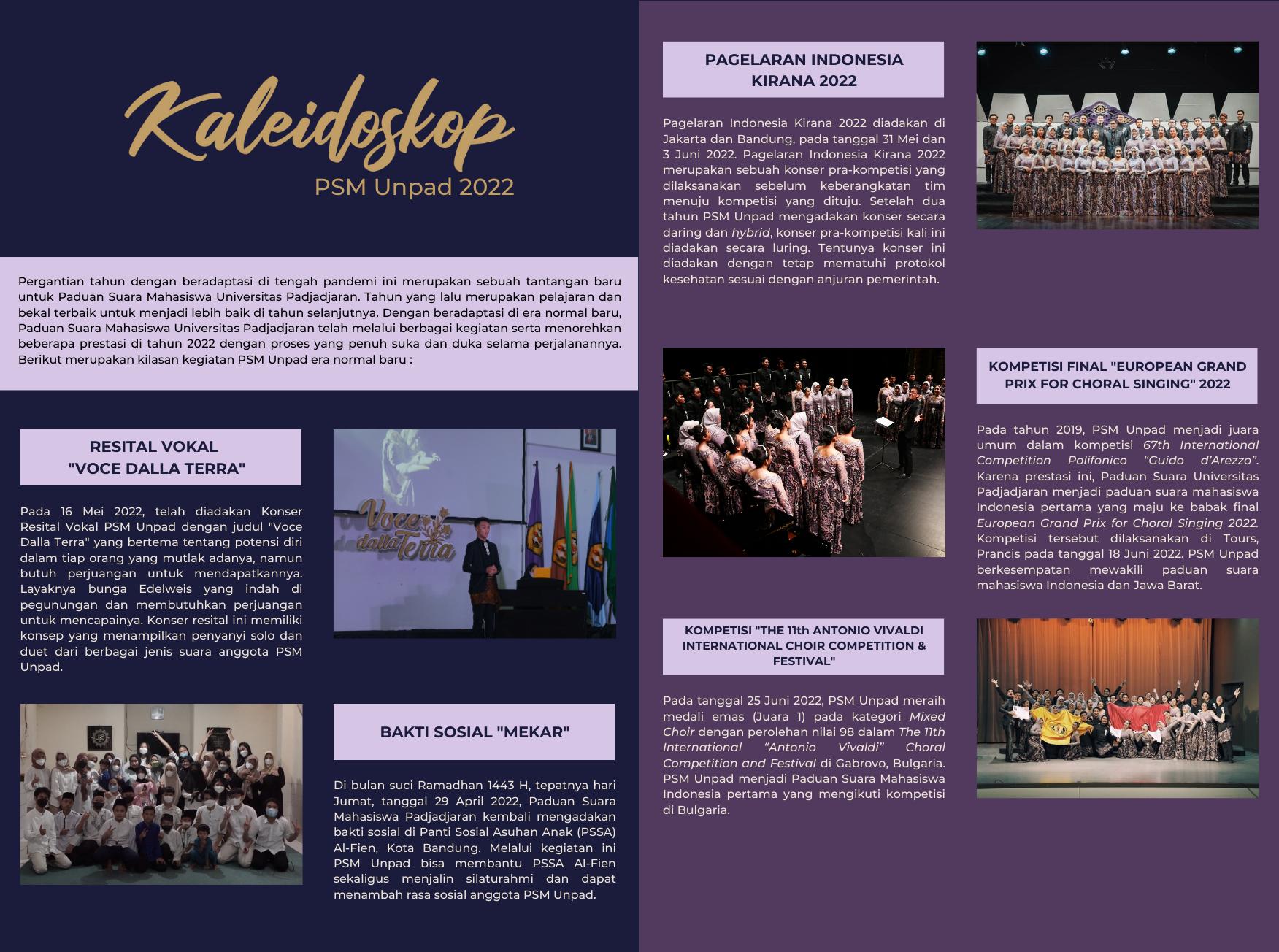Memasuki awal tahun baru, VOICES hadir kembali untuk memberikan informasi dan ulasan menarik mengenai kegiatan dan prestasi PSM Unpad selama tahun 2022. Mari menilik kembali perjuangan tim "Indonesia Kirana 2022" dalam berkompetisi di Final European Grand Prix for Choral Singing 2022 dan The 11th International "Antonio Vivaldi" Choir Competition & Festival. Simak juga ulasan mengenai kegiatan PSM Unpad lainnya di tahun 2022. Selamat membaca!