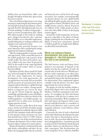 Work can enhance human development, but some work damages it— the link between the two is not automatic The link between work and human development is not automatic. It depends on the quality of work, the conditions of work, the societal value of work and so on. Whether people have a job is important, as are other issues. For example: Is work safe? Are people fulfilled and satisfied by their work? Are there prospects for advancement? Does employment support a flexible work–life balance? Are there equal opportunities for women and men? The quality of work also includes whether a job provides dignity and a sense of pride and whether it facilitates participation and interaction. To strengthen the link with human development, work also has to enhance environmental sustainability. Work strengthens its link with human development when it goes beyond individual benefits to contribute to shared social objectives, such as poverty and inequality reduction, social cohesion, culture and civilization. Conversely, the value of work is diminished and its link with human development becomes weaker when there is discrimination and violence at work. The most observable discrimination is along gender lines—in positions, pay and treatment. In the United States female financial specialists’ salaries are only 66 percent of their male counterparts’. But discrimination also occurs along lines of race, ethnicity, disability Overview | 5