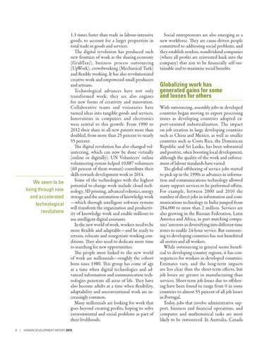 1.3 times faster than trade in labour-intensive goods, to account for a larger proportion in total trade in goods and services. The digital revolution has produced such new frontiers of work as the sharing economy (GrabTaxi), business process outsourcing (UpWork), crowdworking (Mechanical Turk) and flexible working. It has also revolutionized creative work and empowered small producers and artisans. Technological advances have not only transformed work; they are also engines for new forms of creativity and innovation. Collaborative teams and visionaries have turned ideas into tangible goods and services. Innovations in computers and electronics were central to this growth: From 1990 to 2012 their share in all new patents more than doubled, from more than 25 percent to nearly 55 percent. The digital revolution has also changed volunteering, which can now be done virtually (online or digitally). UN Volunteers’ online volunteering system helped 10,887 volunteers (60 percent of them women) contribute their skills towards development work in 2014. Some of the technologies with the highest potential to change work include cloud technology, 3D printing, advanced robotics, energy storage and the automation of knowledge work —which through intelligent software systems will transform the organization and productivity of knowledge work and enable millions to use intelligent digital assistants. In the new world of work, workers need to be more flexible and adaptable—and be ready to retrain, relocate and renegotiate working conditions. They also need to dedicate more time to searching for new opportunities. The people most linked to the new world of work are millennials—roughly the cohort born since 1980. This group has come of age at a time when digital technologies and advanced information and communication technologies penetrate all areas of life. They have also become adults at a time when flexibility, adaptability and unconventional work are increasingly common. Many millennials are looking for work that goes beyond creating profits, hoping to solve environmental and social problems as part of their livelihoods.